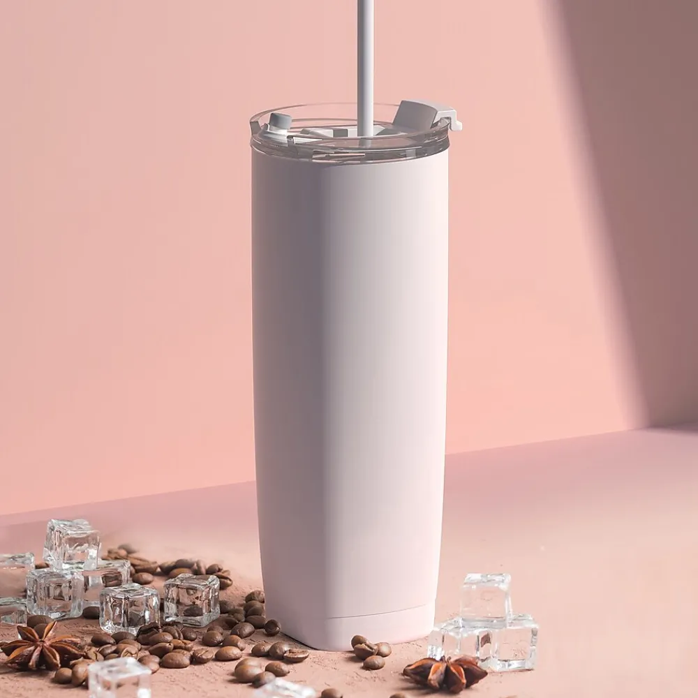 The Pink Aquilina from Asobu is a 20-oz., double-wall stainless steel tumbler, with a dual-purpose lid. It can accommodate either hot or cold drinks. Open the middle hole and insert the included straw for cold drinks. For hot drinks, use the flip-over lid covering. It keeps drinks cold up to 24 hours or hot up to 6 hours. It fits into a standard vehicle cupholder.