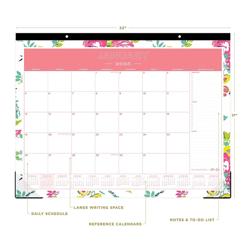 Made for 2025, the Blue Sky Day Designer Peyton White desk pad calendar provides a visual overview of your schedule. This 12-month desk pad calendar has monthly checklists, so you can check off accomplishments as you go. Enjoy gold-tone foil text, high-quality white paper, and 12 reference calendars per month.