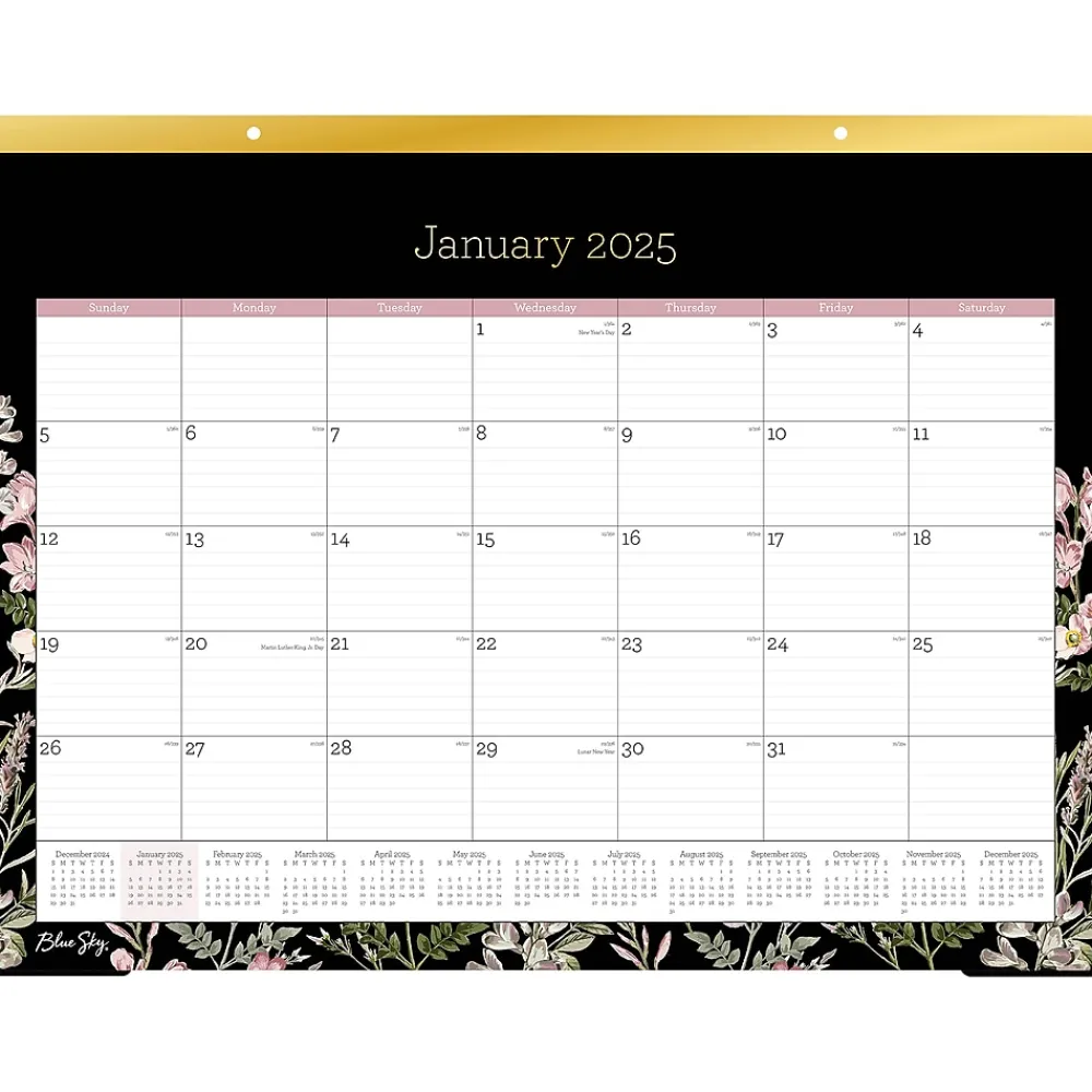 Made for 2025, the Blue Sky Nevaeh desk pad calendar provides a visual overview of your schedule. This 12-month calendar gives you ample writing space to track deadlines, birthdays, and events. Enjoy high-quality white paper, large text for easy reading, and reference calendars to help you plan.