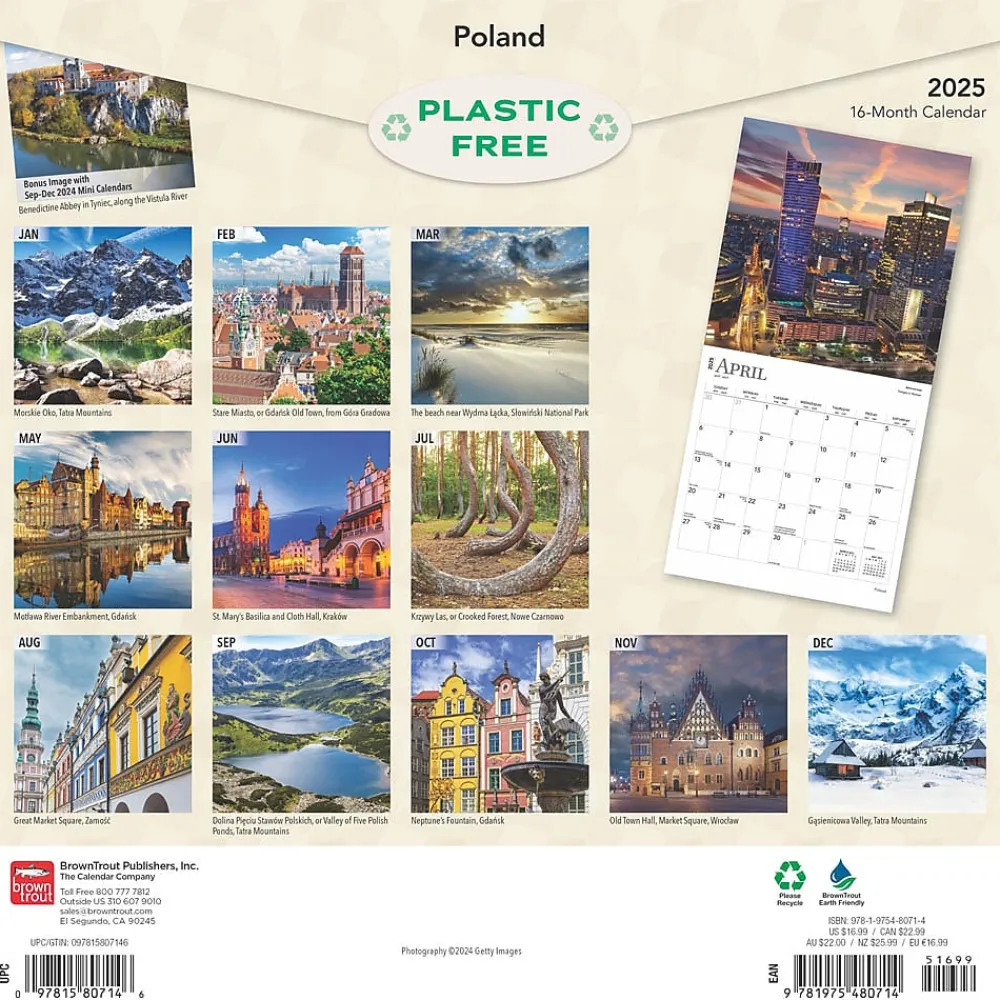 Poland is a beautiful country, rich with history and culture. Don’t be fooled by the notorious cold winters—that’s only one part of Polish culture and lore. In fact, the people of Poland are warm and welcoming. This calendar features images of famous architectural points of interest, city scenes, as well as rural natural landscapes.