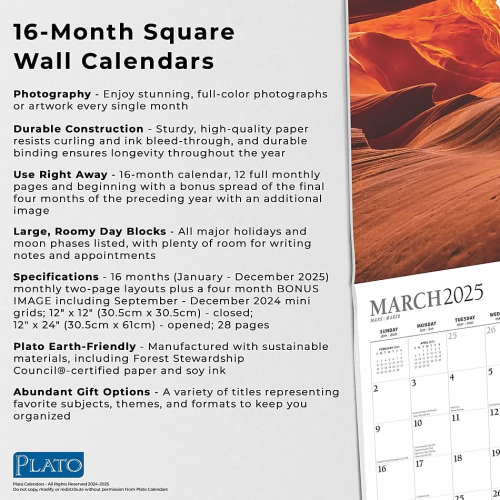 - Specifications – 16 months (two-page layout September–December 2024, and January–December 2025); 12″ x 12″ (closed); 12″ x 24″ (opened); 28 pages