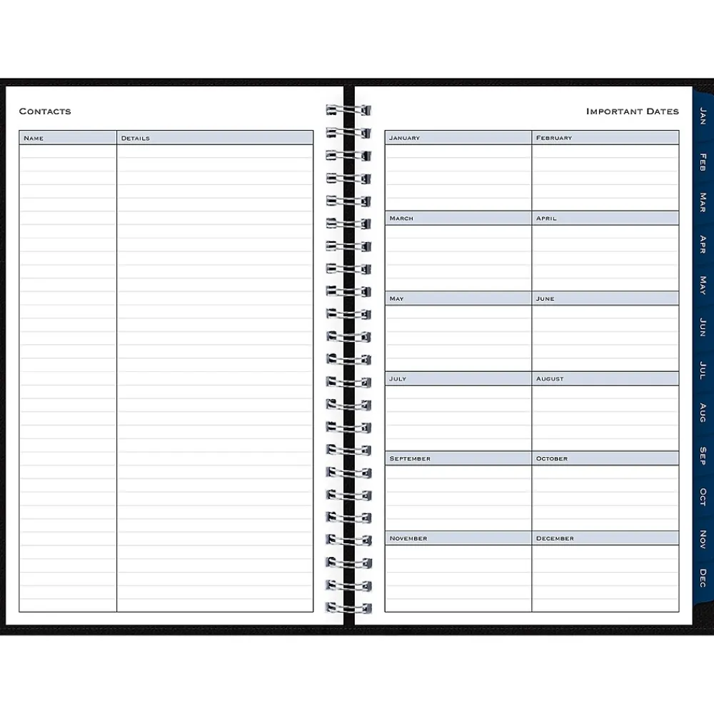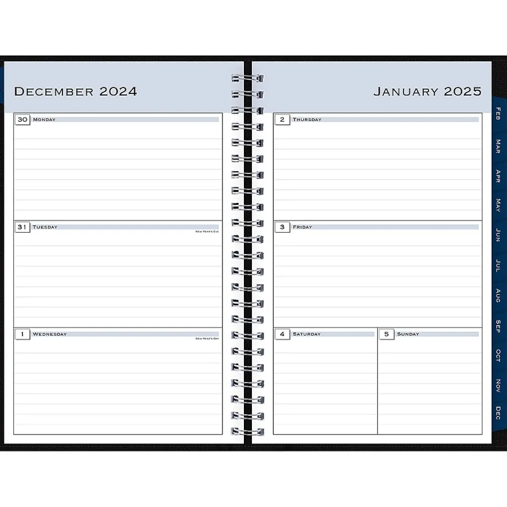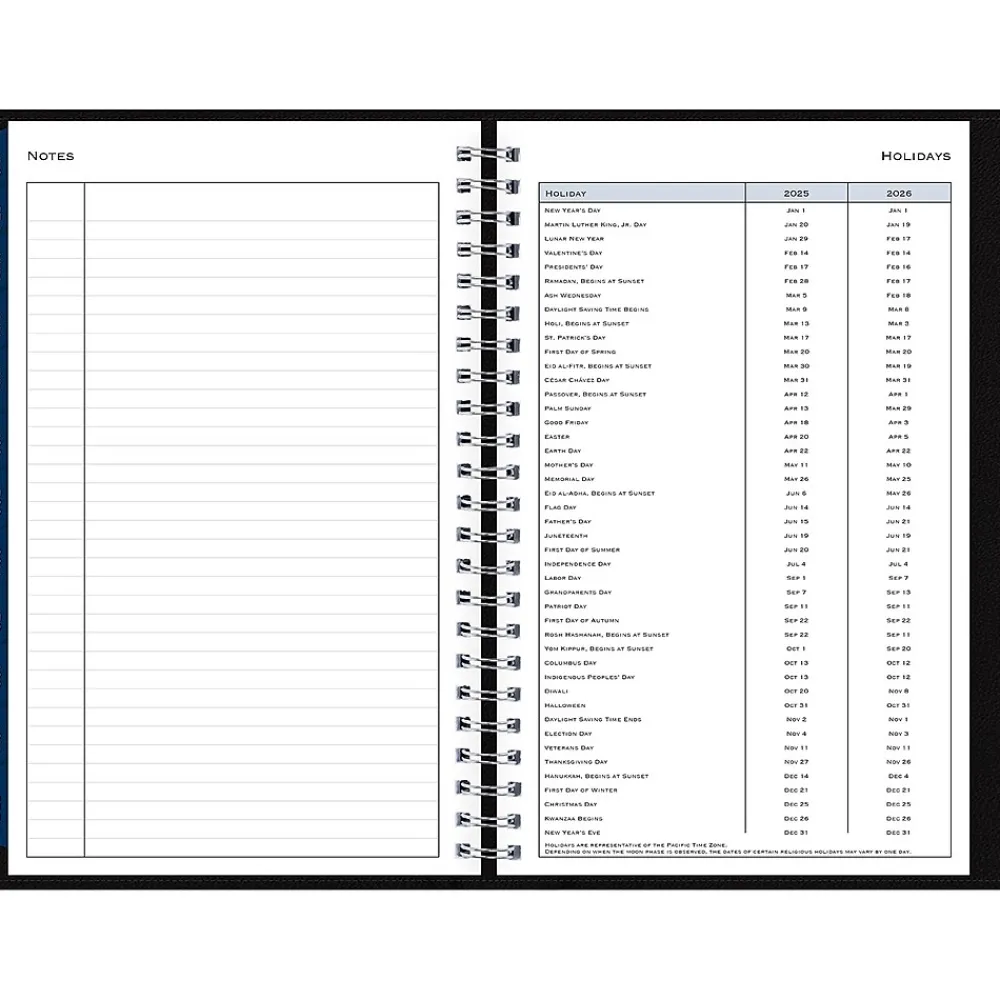 - Offers one week per two pages and one month per two pages, with space for notes and quick reference calendars
