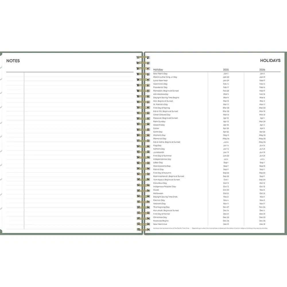 - Offers one week per two pages and one month per two pages, with space for notes and quick reference calendars