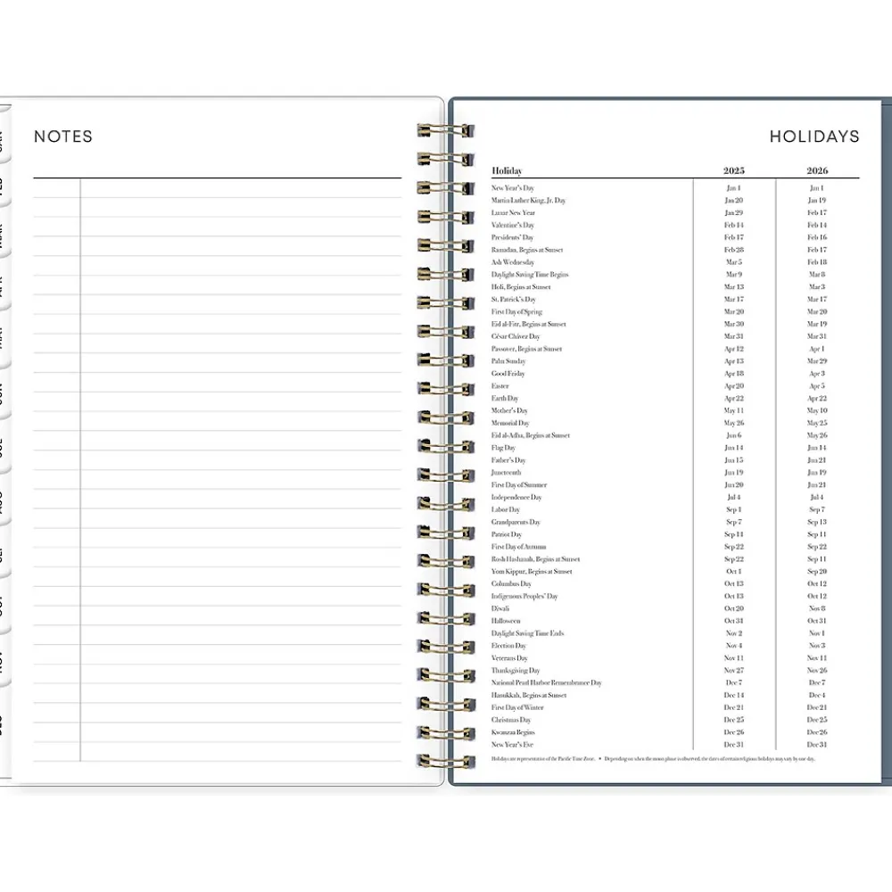 - Yearly overview, list of major holidays, and pages for your contacts, goals, important dates, and notes