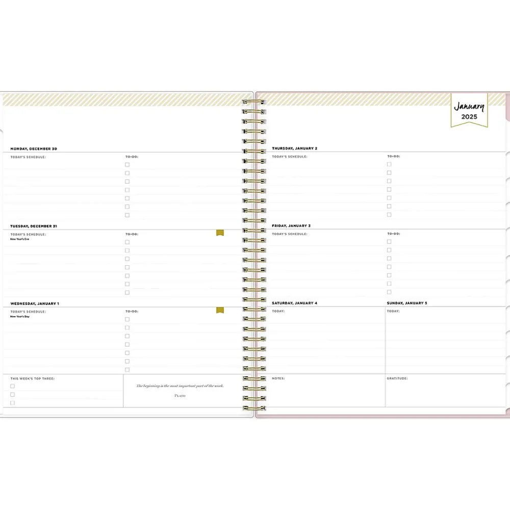 - Features two-page weekly spreads, with space for notes and quick reference calendars