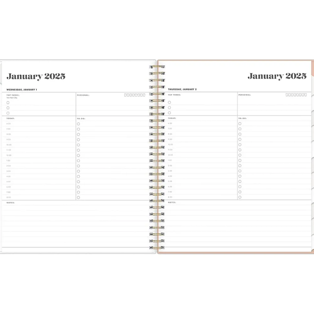 - Offers one day per page with hourly planning slots and sections for priorities, notes, and to-dos; one month per two pages, with space for notes and quick reference calendars