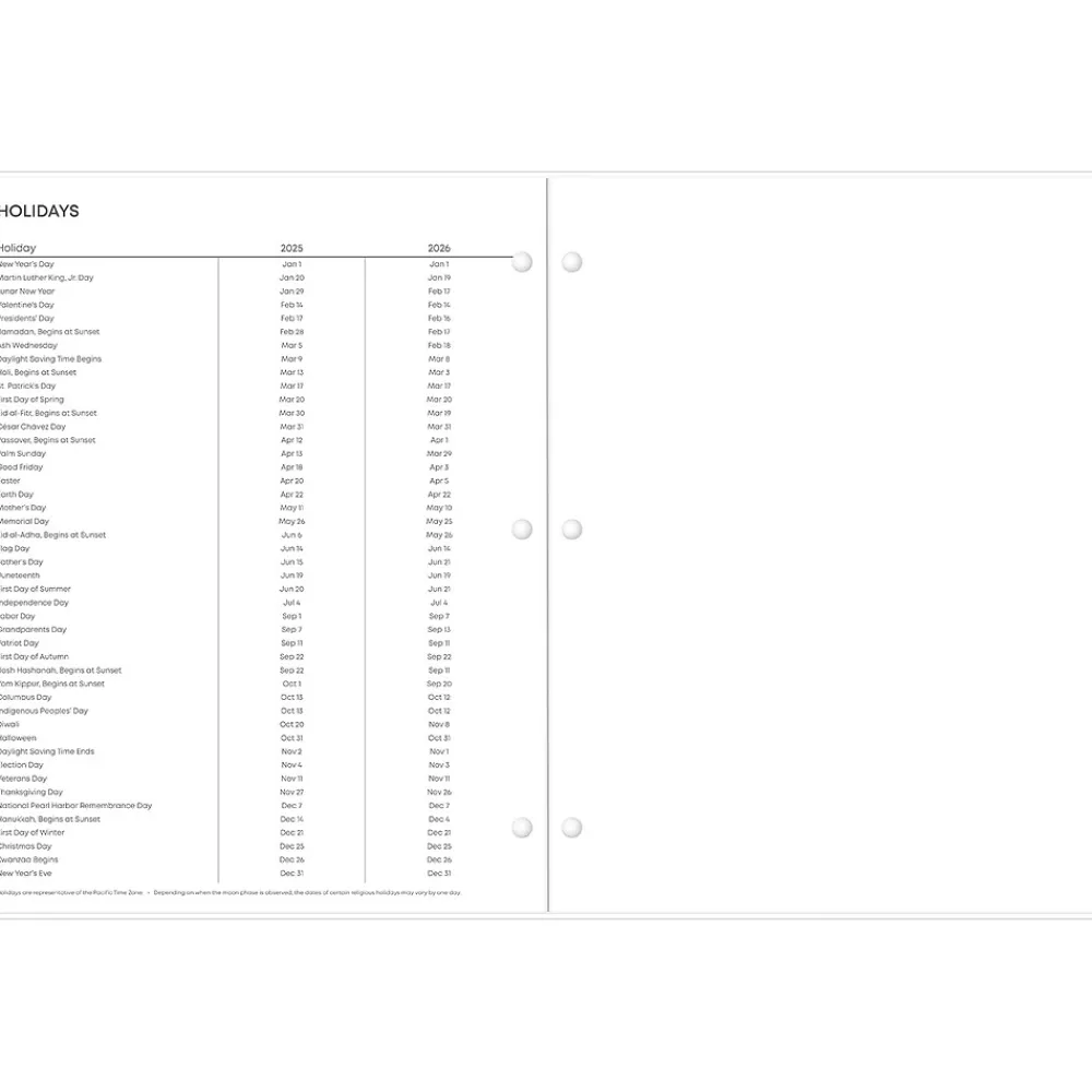- Yearly overview, list of major holidays, and pages for your contacts, goals, important dates, and notes