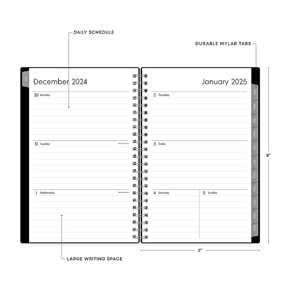 A simple planner for busy schedules. Organize your tasks and time with the Enterprise weekly and monthly 2025 planner from Blue Sky. Use the ruled weekly layouts, tabbed monthly views, and notes pages to manage your schedule and achieve your goals.