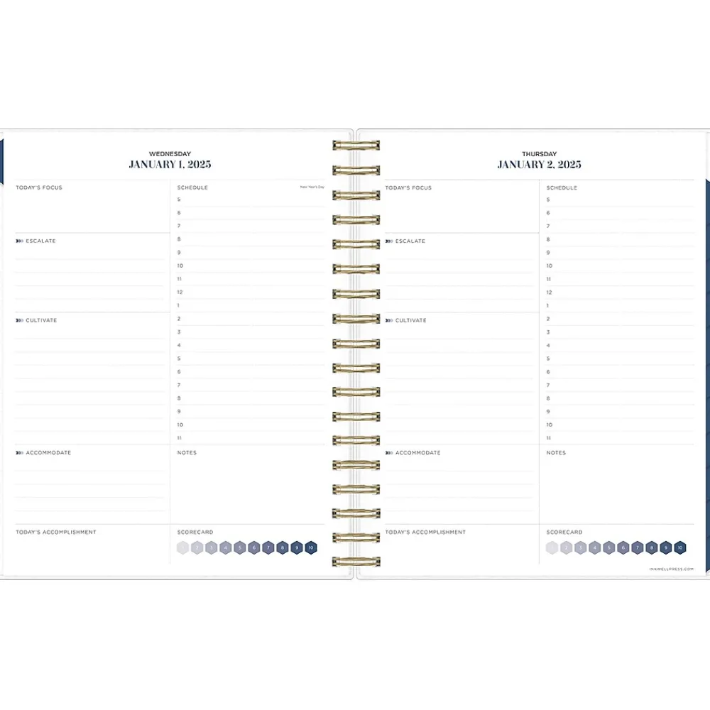 Achieve your goals with inkWELL Press for Blue Sky productivity planners, designed by time management expert Tanya Dalton. This Ombre Sky2025 planner includes the inkWELL Press flexible weekly layouts with tabbed monthly views and notes pages after every month. Use the goal-setting worksheets, monthly mission boards, and habit trackers to track your progress throughout the year. Includes stickers and a paper storage pocket.