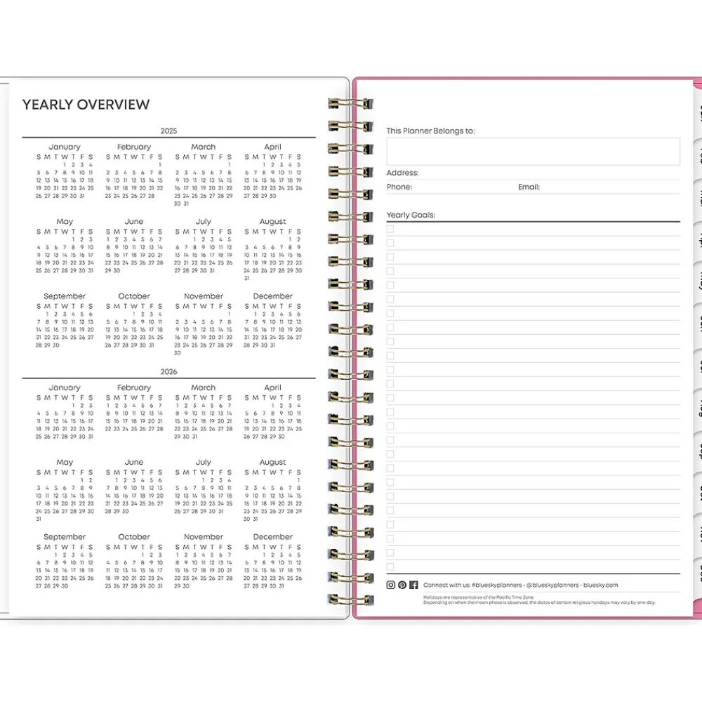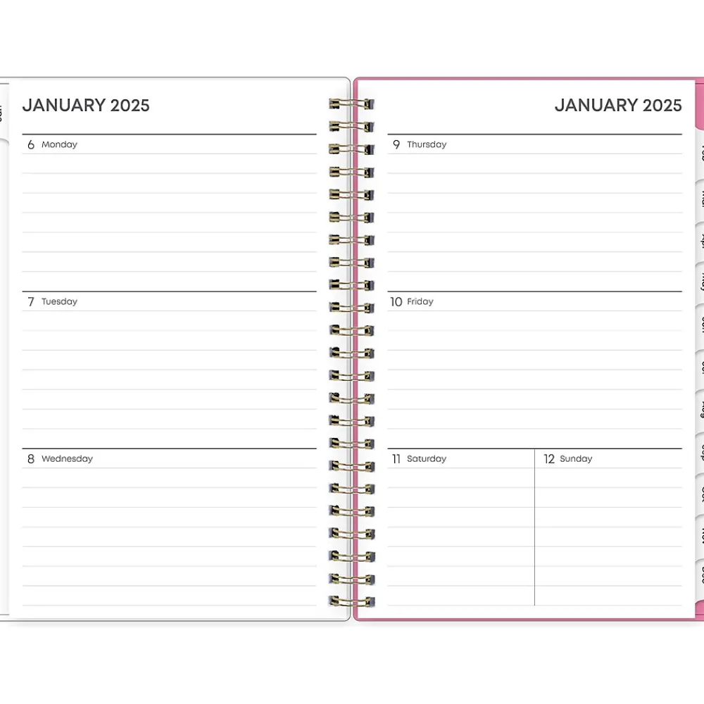 Organize tasks and time with a 2025 weekly and monthly planner from Blue Sky. The Juno Pink planner offers lined weekly layouts, tabbed monthly views, and notes pages to help you manage your schedule and achieve your goals.