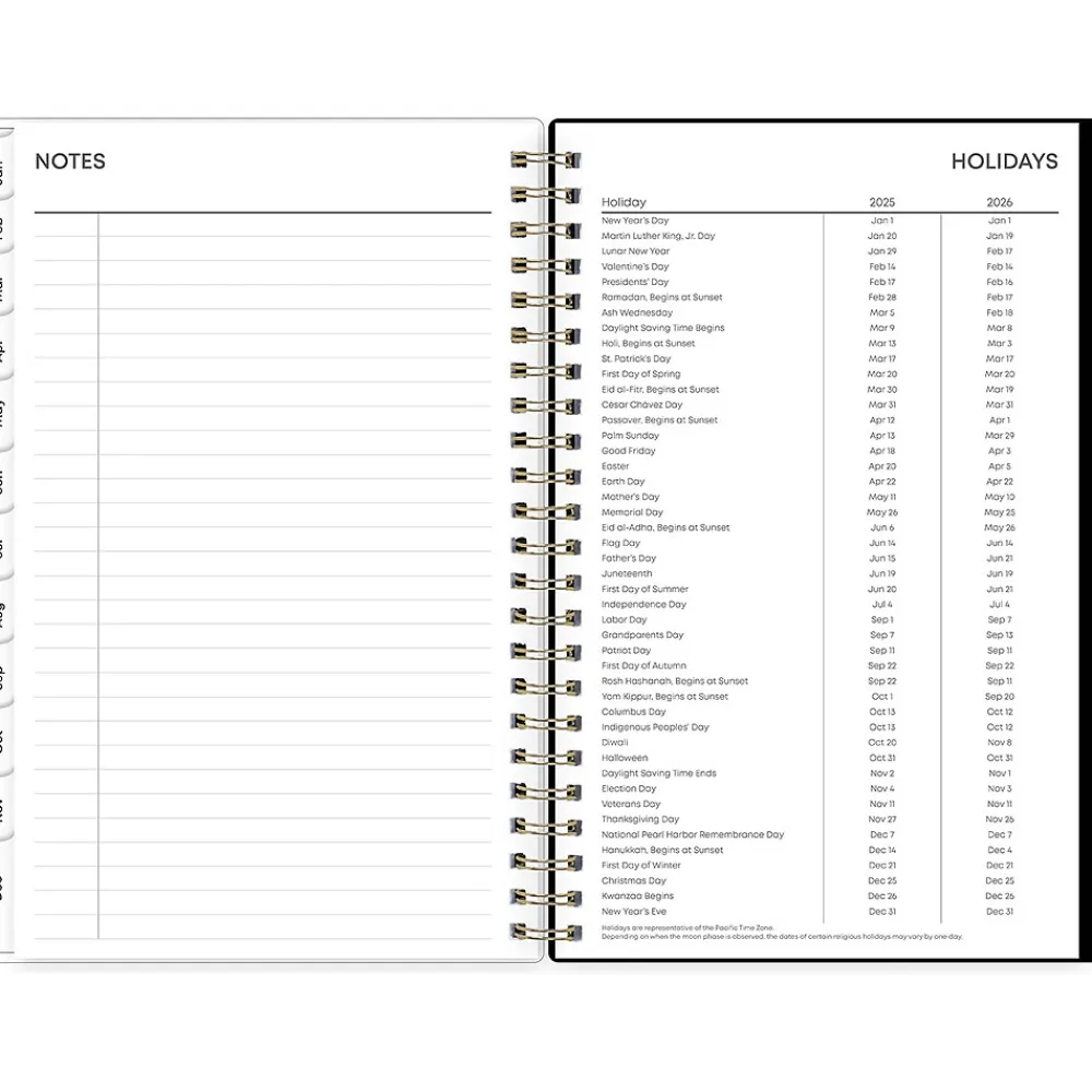 - Features two-page weekly and monthly spreads, with space for notes and quick reference calendars