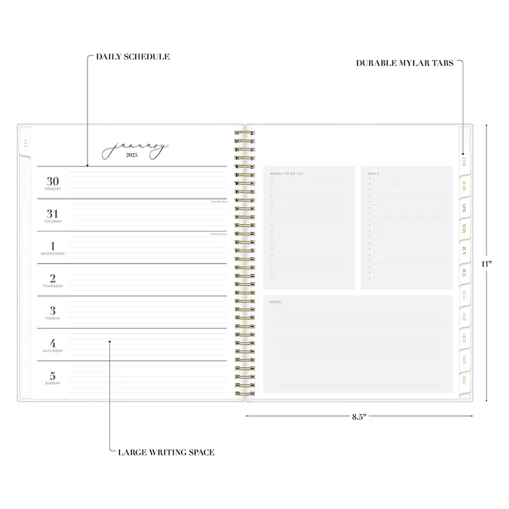 - Goal-focused weekly layouts, with the week on the left side, and sections for notes, goals, and to-dos on the right; one month per two pages offers a column for notes and quick reference calendars