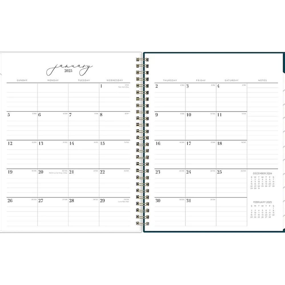 - Offers goal-focused weekly layouts with the week on the left page and sections for notes, goals, and to-dos on the right; and one month per two pages, with space for notes and quick reference calendars
