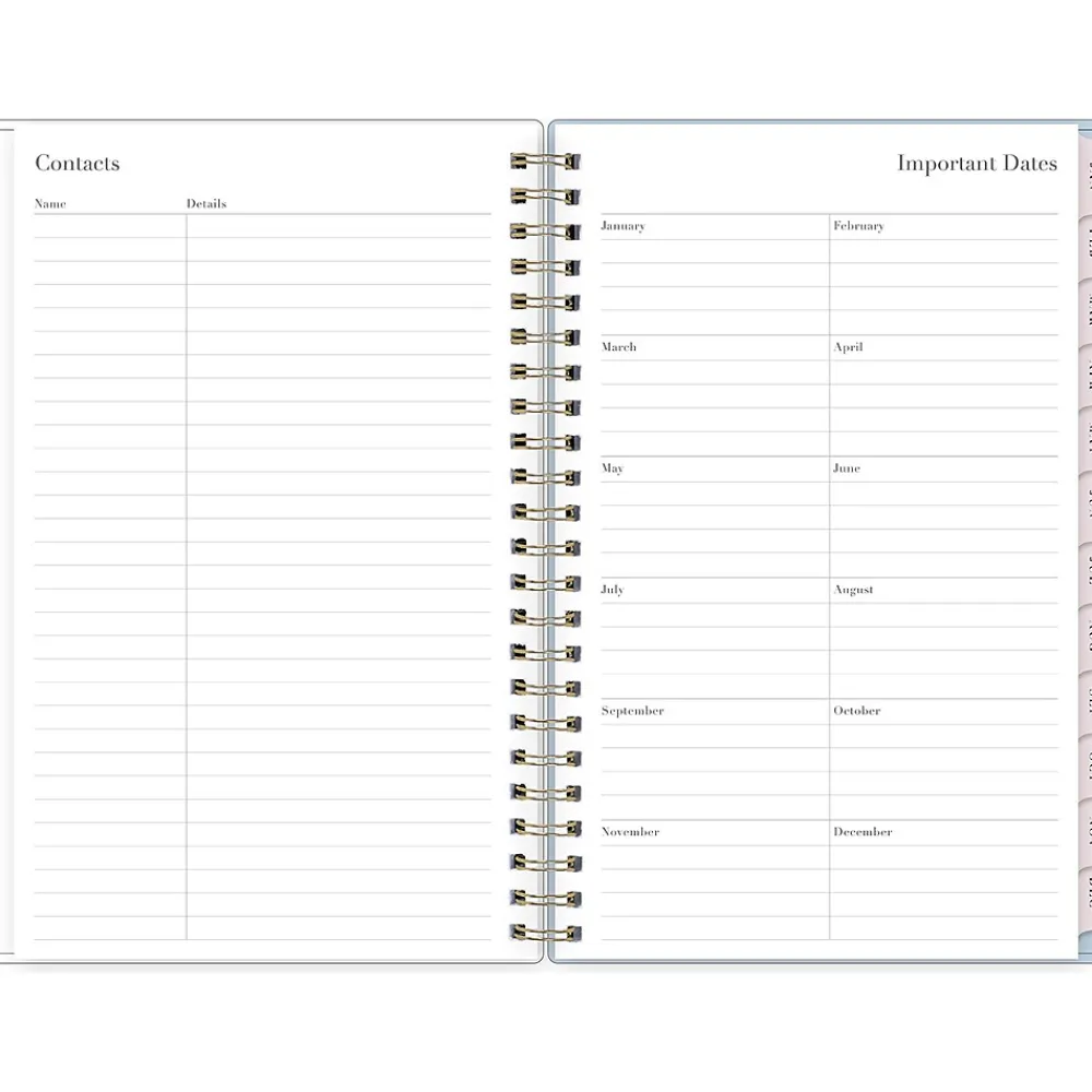 - Yearly overview, list of major holidays, and pages for your contacts, goals, important dates, and notes