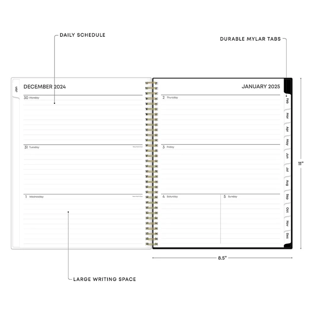 Organize your tasks and time with this Vonnie 2025 weekly and monthly planner from Blue Sky. Use the included storage pocket, ruled weekly layouts, tabbed monthly views, and notes pages to manage your schedule and achieve your goals.