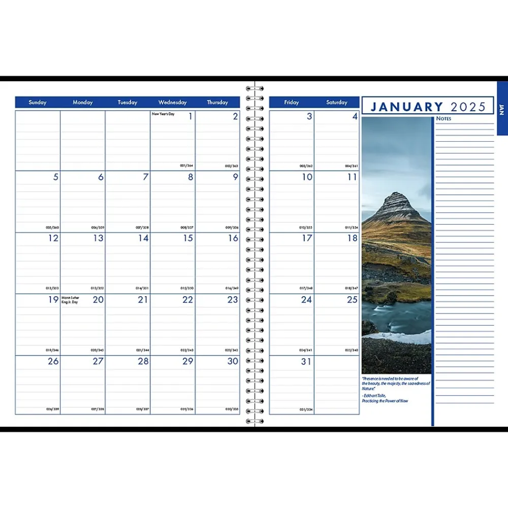The House of Doolittle Earthscapes weekly and monthly planner offers 12 months of uninterrupted easy planning, from January 2025 through December 2025. Both monthly and weekly two-page spreads feature a full-color nature photo and a notes section to keep you organized and motivated. Plus, they include Julian dates and days remaining. Each monthly two-page spread features a tab for easy reference and also allows you to see important dates and reminders. The weekly spreads feature hourly appointments from 8:00 a.m. until 6:00 p.m. The planner is spiral-bound with 90% recycled wire and features a one-piece black embossed leatherette cover to withstand the daily use throughout the year. Printed with soy-based inks on 100% postconsumer recycled paper. Made in the USA and is FSC certified.
