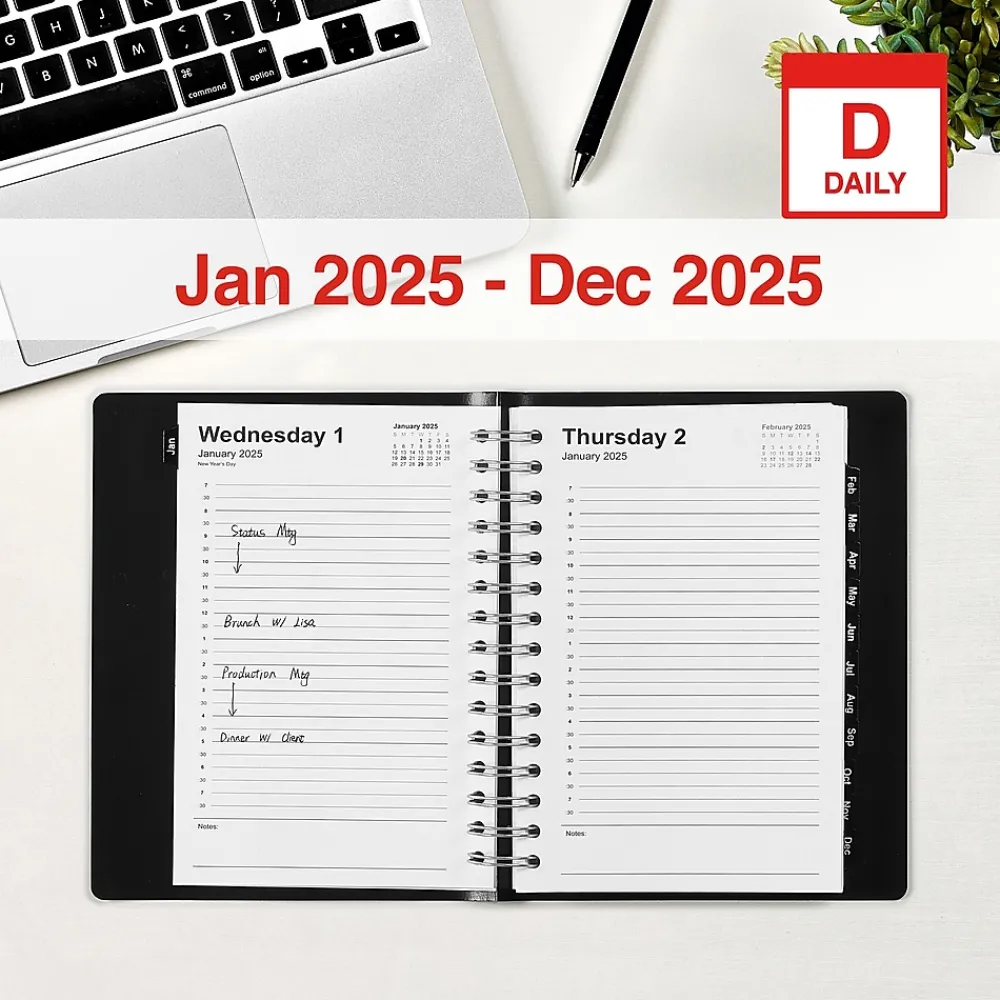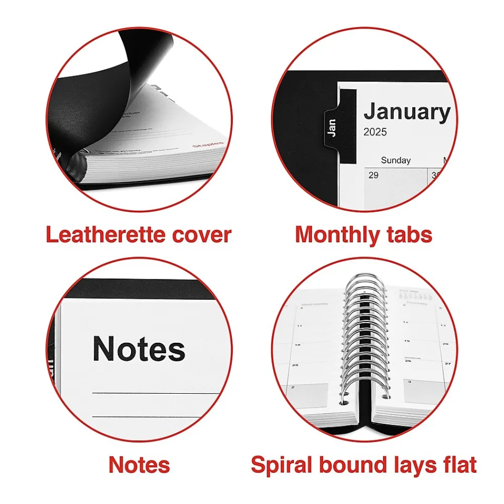 Plan your day in detail with this daily appointment book. The spiral twin-loop wire binding makes it easy to flip through the pages, while the black leatherette cover with a silver logo lends a professional look. This Staples 5 x 8-inch 2025 daily appointment book features appointment pages with 30-minute intervals so you can track important events.