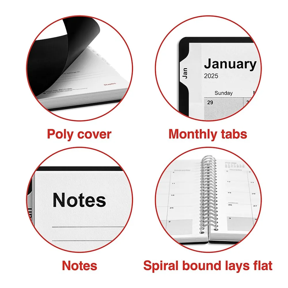 Identify upcoming meetings, appointments, and activities with this 2025 weekly and monthly planner. The 186 preprinted pages cover 14 months, offering ample space for writing down goals and plans, while the twin-wire double-loop binding lets you flip through the pages effortlessly. This Staples black 5 x 8-inch 14-month weekly and monthly planner has a sturdy poly cover for strength and lasting quality.