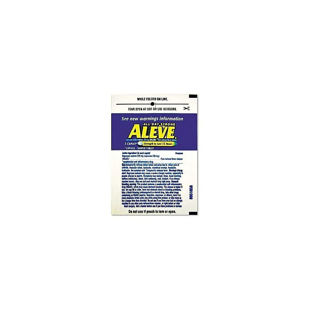 Restock your office, home or team first aid kit with these pain reliever packets. Each packet contains one long-acting tablet designed to help relieve everything from symptoms of the common cold to toothaches. Individually wrapped for easy distribution and cleanliness, these Aleve caplets are ideal for carrying in a briefcase or stashing in the breakroom.
