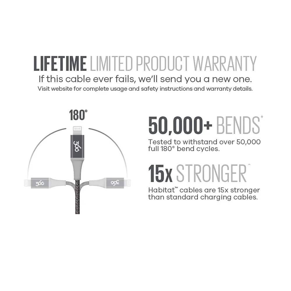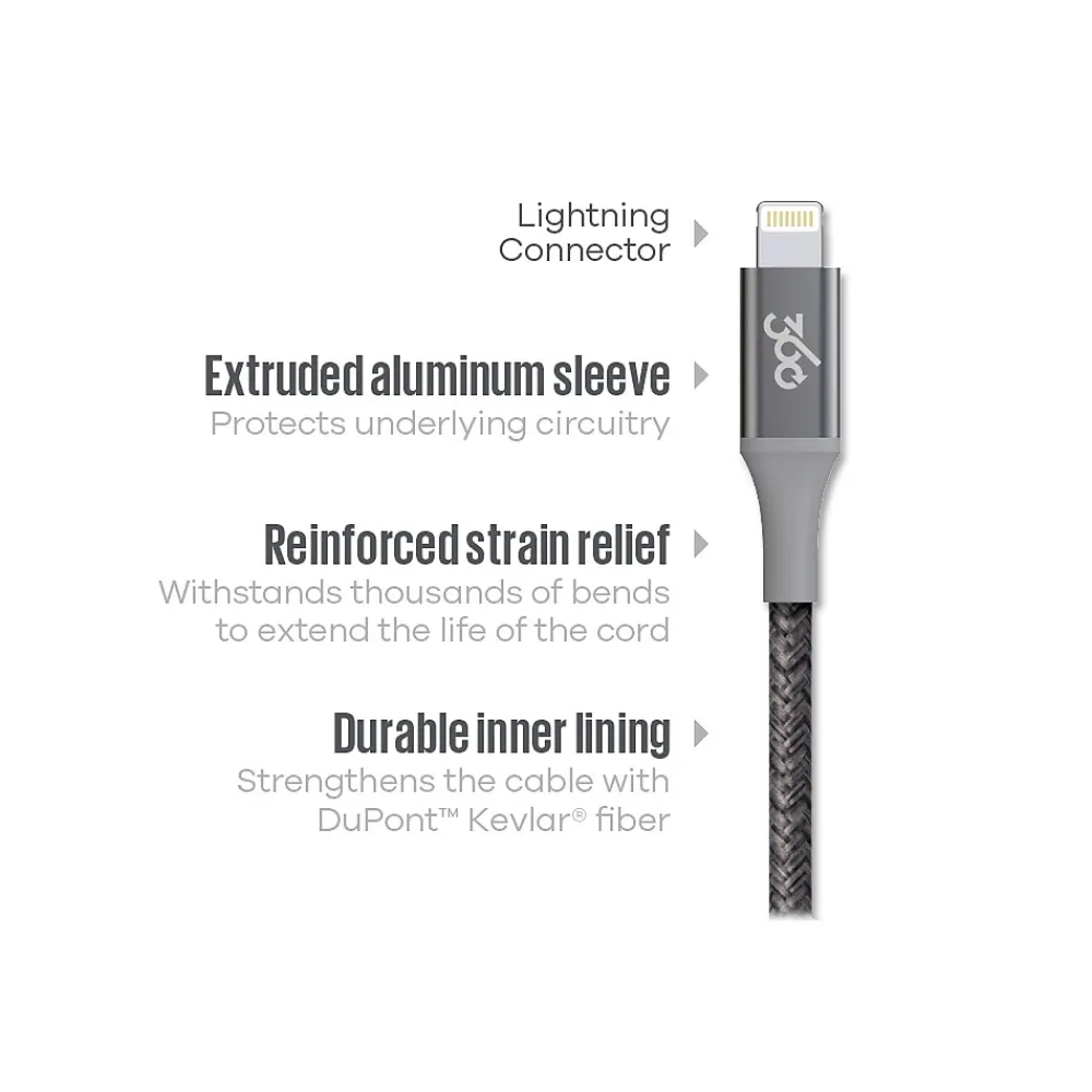 Use this Lightning to USB cable to charge and sync your iPhone or iPad at your desk. Its extruded aluminum sleeve protects underlying circuitry. The reinforced strain relief withstands thousands of bends to extend the life of the cord.