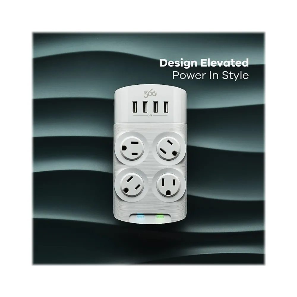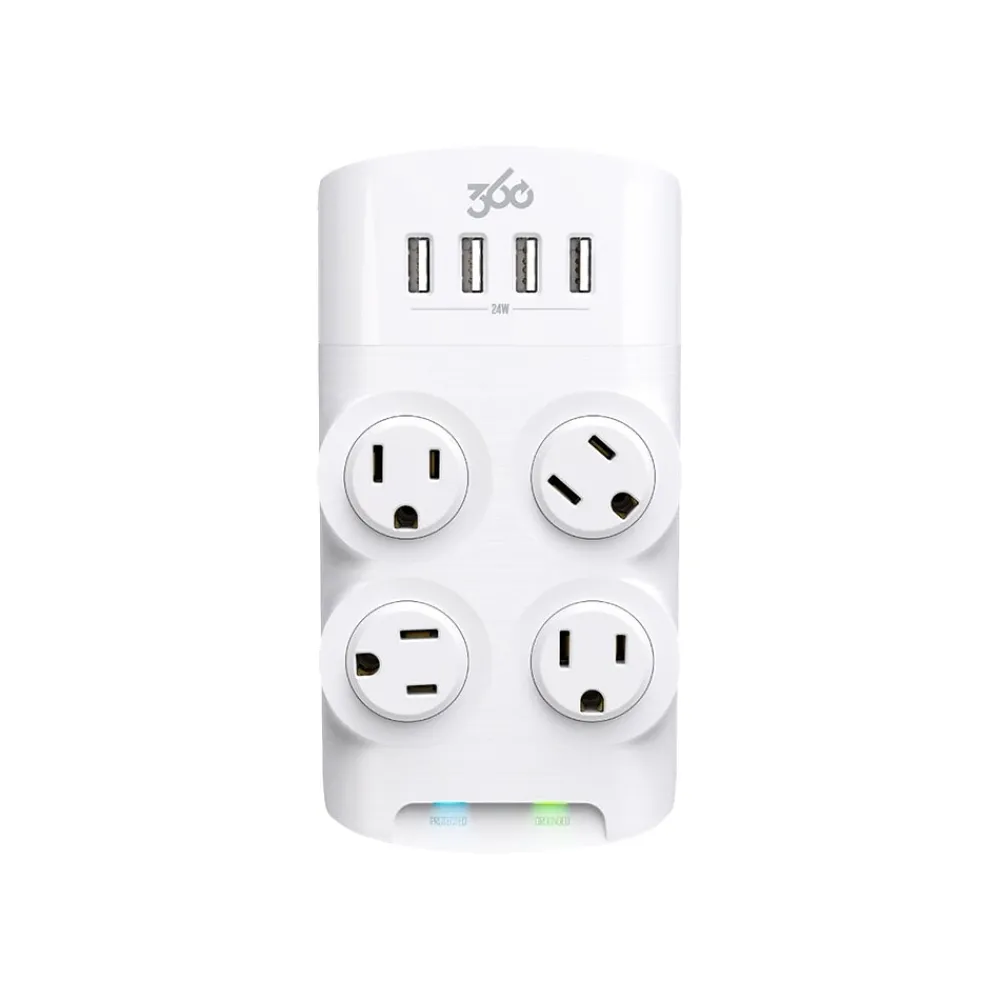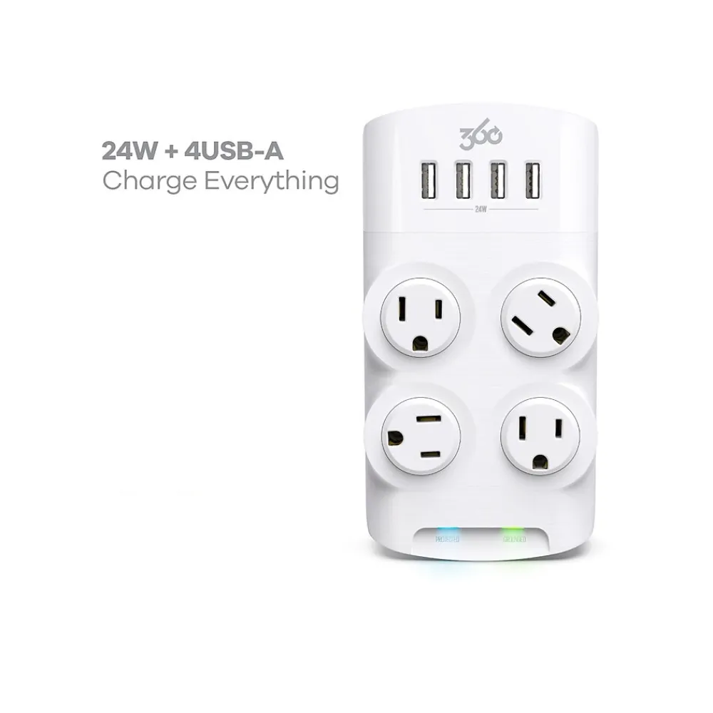 Charge all your devices with 24W of power shared across four USB Type-A ports integrated into this 360 Electrical Revolve24 four-outlet adapter. Precision-directed LEDs keep you updated without the glare. Secure your phone on the subtle yet super stable integrated cradle.
