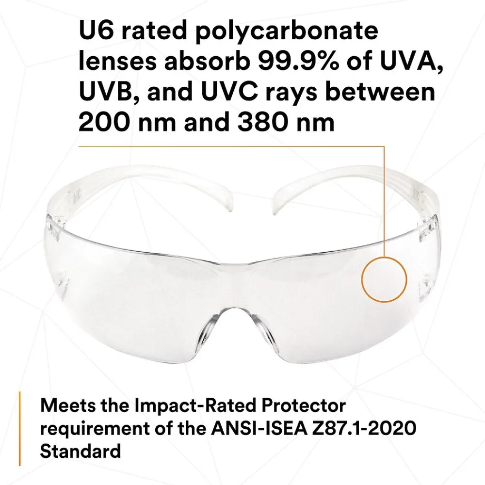 - Polycarbonate lenses absorb 99.9% UVA and UVB up to 380 nm and meet the requirements of CSA Z94.3 and ANSI Z87.1-2015.