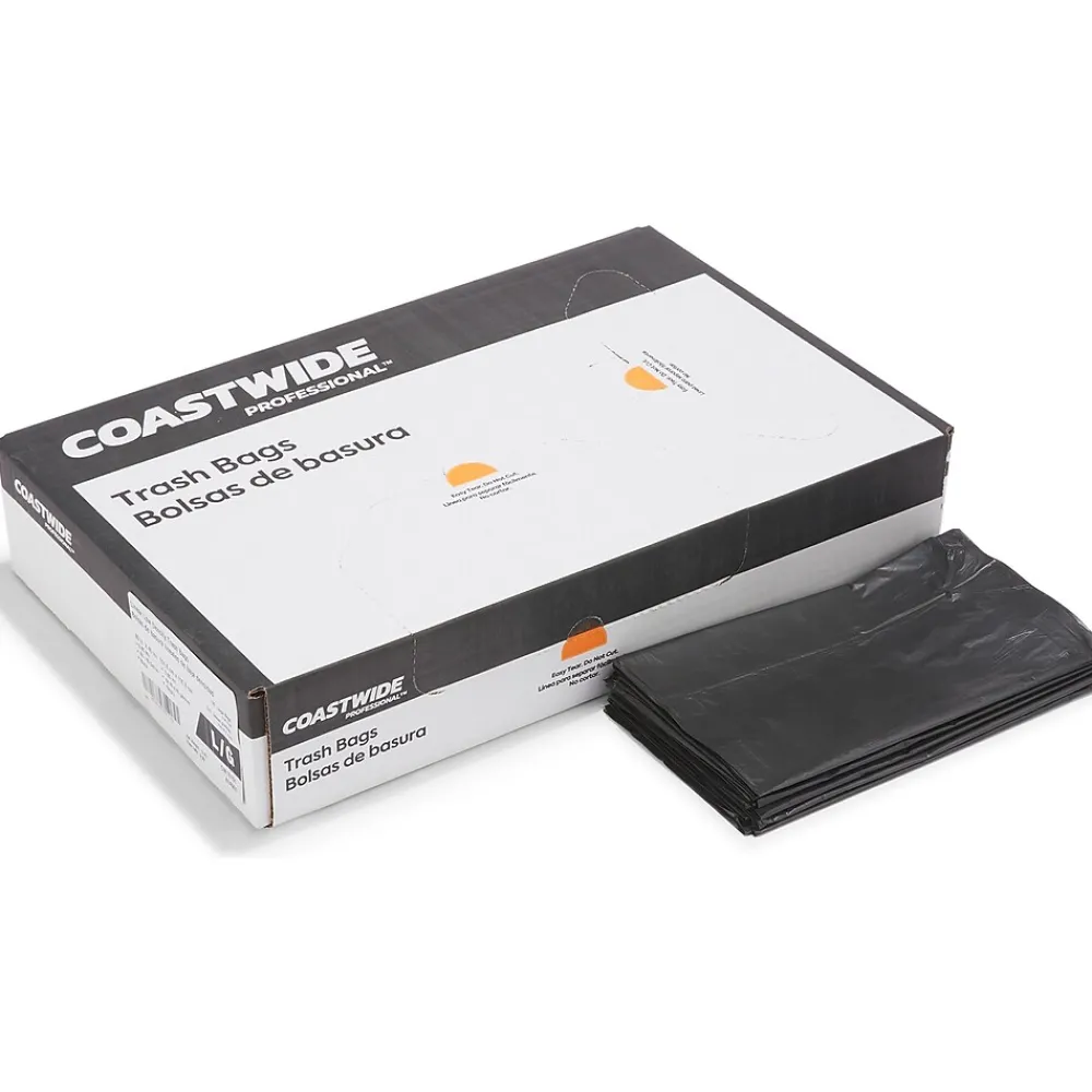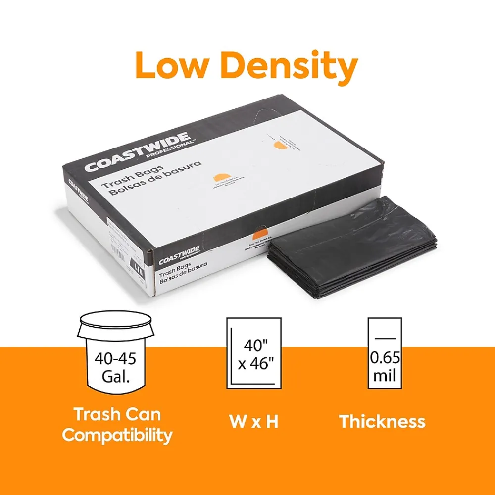 Make cleaning up office garbage easier with these trash bags. The black low-density plastic conceals waste from sight, offers lasting durability and stands up to heavy loads without stretching or tearing. Capable of holding up to 45 gallons, these Coastwide Professional™ black low-density trash bags fit plenty of garbage so you can go longer before emptying.
