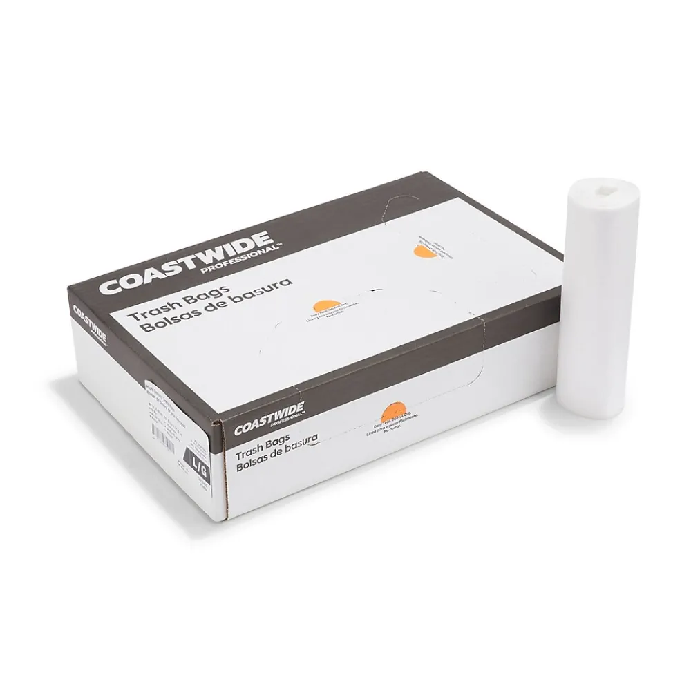 Practice responsible waste management with these medium-strength transparent trash bags. This carton of 250 comes in 25 pieces per 10 rolls for easy distribution, and the 0.47-mil thickness offers a higher load capacity. These Coastwide Professional™ natural high-density trash bags fit recycling bins with a capacity of 40-45 gallons for use in busy commercial kitchens, office buildings and public areas.