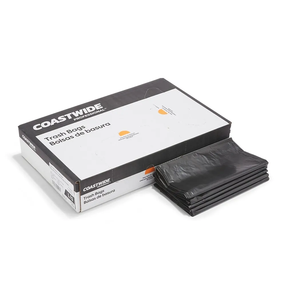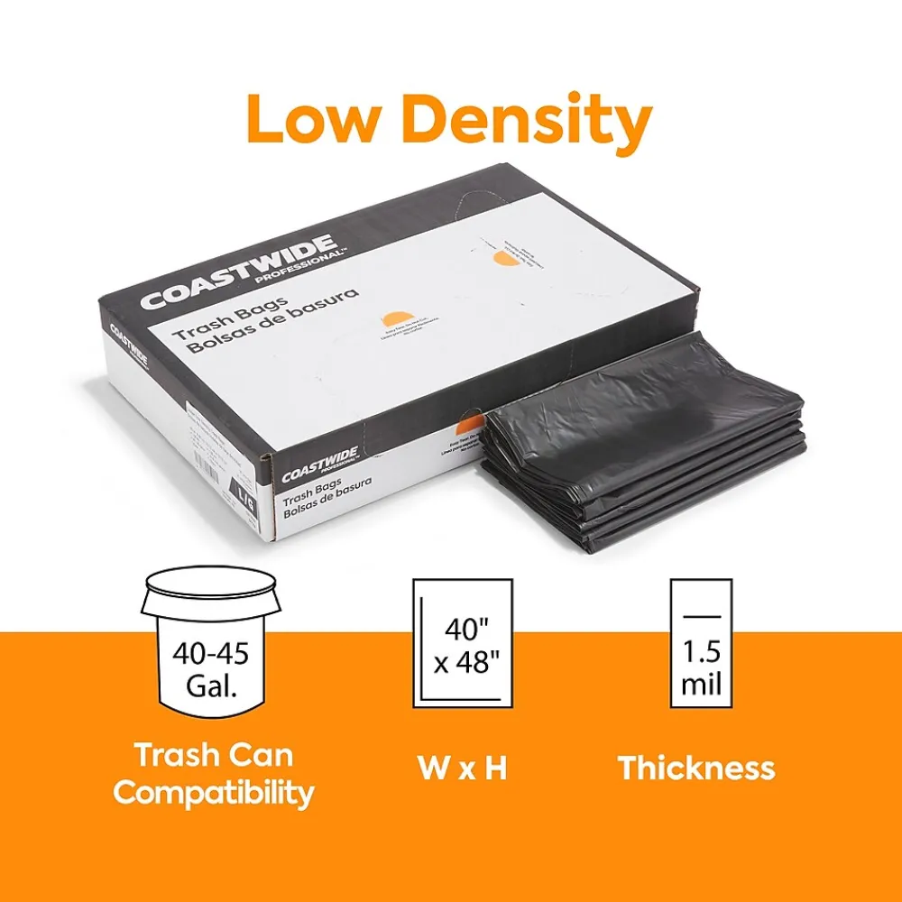 Keep offices free from refuse with these trash bags. The 40-45 gallon sizes fit a variety of home and office trash receptacles, and the black color conceals contents and helps maintain privacy. Made from low-density polyethylene, these Coastwide Professional™ 40-45 gallon trash bags resist stretching under the weight of heavy or wet objects and hold sharp items without tearing.