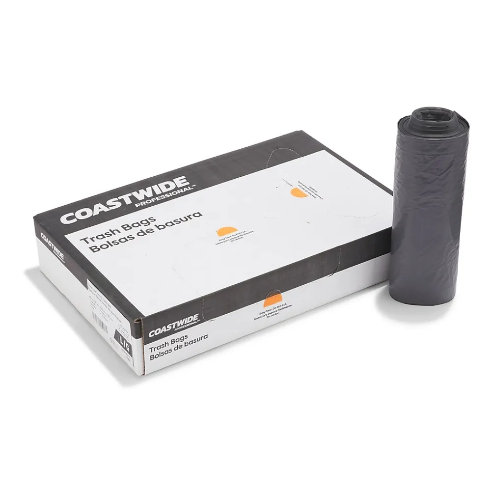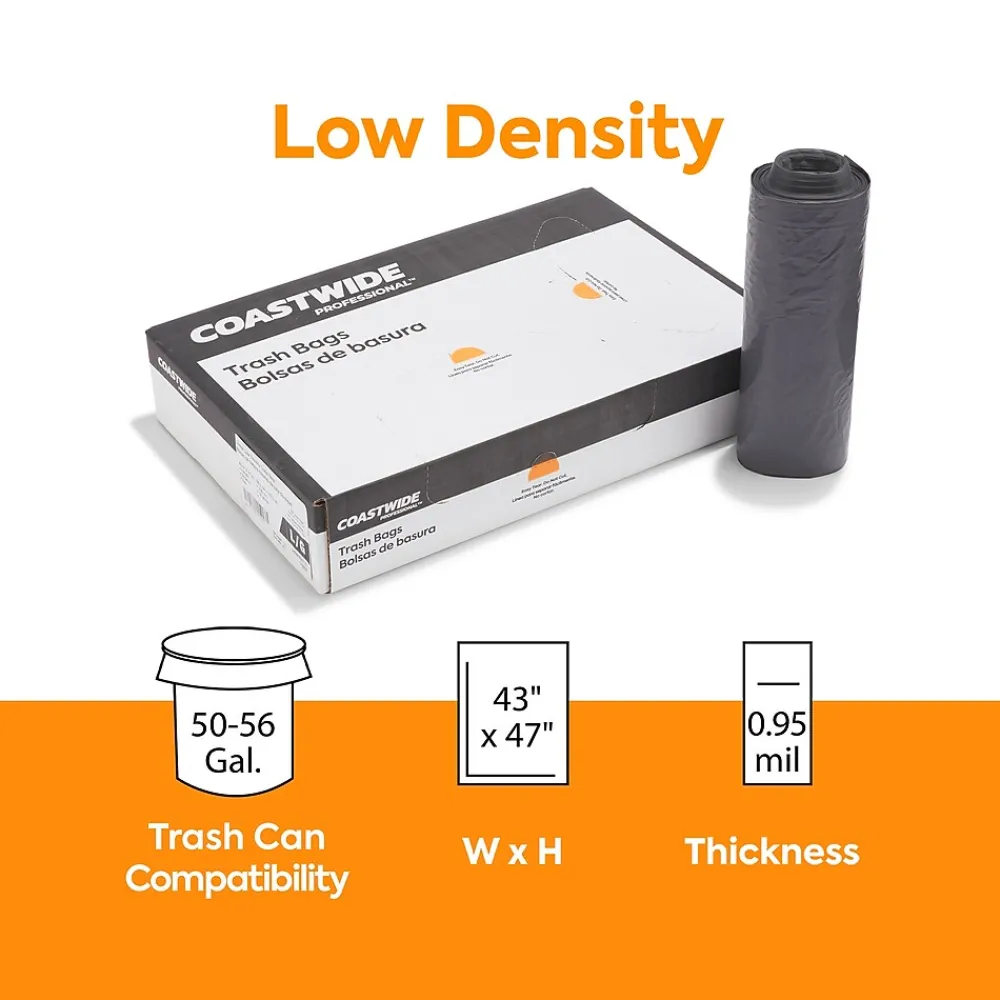 Take out garbage from your office and events securely with these super-heavy trash bags. The opaque gray material conceals the contents to ensure discretion, while the low-density plastic resists stretching and tearing to avoid liquid leaks for safe and mess-free disposal. These Coastwide Professional™ trash bags can hold 50 to 56 gallons of waste and fit large receptacles in most offices.