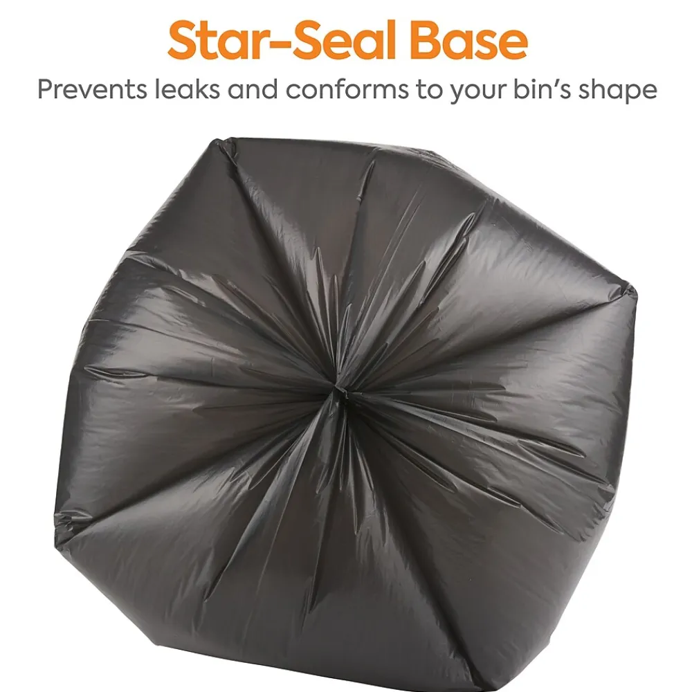 Stock a supply of these black trash bags to line your commercial bins. The opaque material keeps the contents hidden for discretion, while the low-density material prevents heavy objects from stretching or ripping to avoid leaks, making them suitable for cafeterias and other public spaces. Featuring a 50 to 56-gallon capacity, these Coastwide Professional trash bags provide plenty of room for garbage and have star-sealed bottoms to maximize carrying capacity.