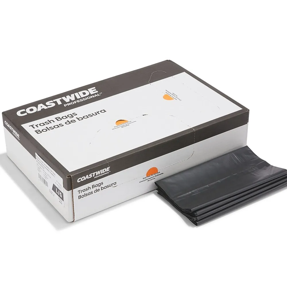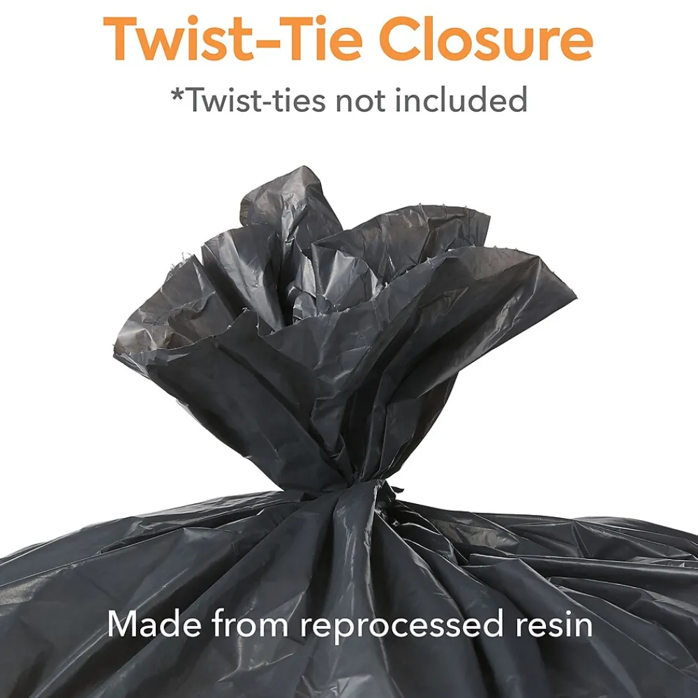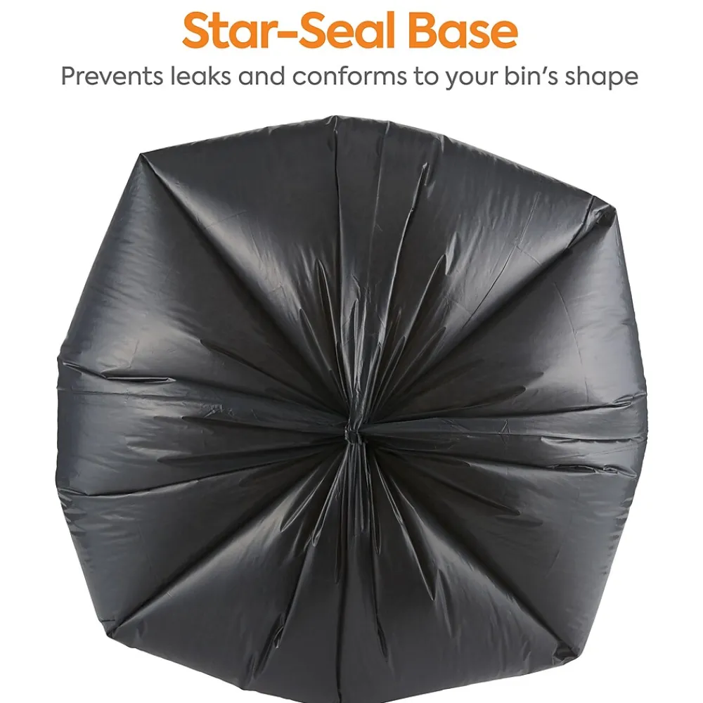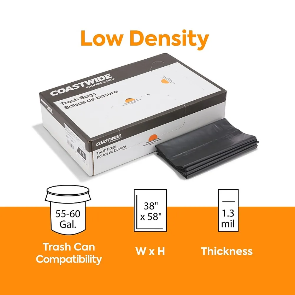 Reduce the risk of tears and leaks while taking out the garbage with these black trash bags. The star-sealed bottom distributes weight evenly to maximize carrying capacity and resists leaks, while the 55- to 60-gallon capacity offers ample room for bulky items. These 1.3-mil-thick Coastwide Professional™ trash bags are made of reprocessed resin to resist puncturing by sharp objects, ensuring clean, reliable waste disposal.