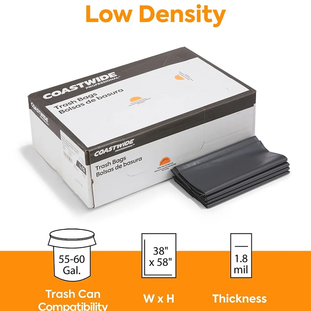 Handle garbage discreetly with these black trash bags. The 55 to 60-gallon capacity offers plenty of room for industrial use, taking on large and heavy items for quicker cleanup. These heavy-strength Coastwide Professional™ heavy-strength trash bags are made with reprocessed resin to resist puncturing by sharp objects and are packaged in a 100-count carton to address the needs of job sites and public waste management demands.