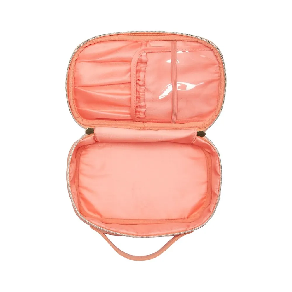 Make a statement when you travel with the bright coral mini train case by scunci. This small but spacious case has a textured quilted surface, built-in brush holder, top handle for convenient carrying, and two gold-tone coil zippers with matching metal hardware. Pack up and go with the glam case that gets you there in style.