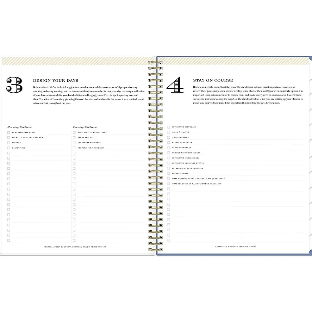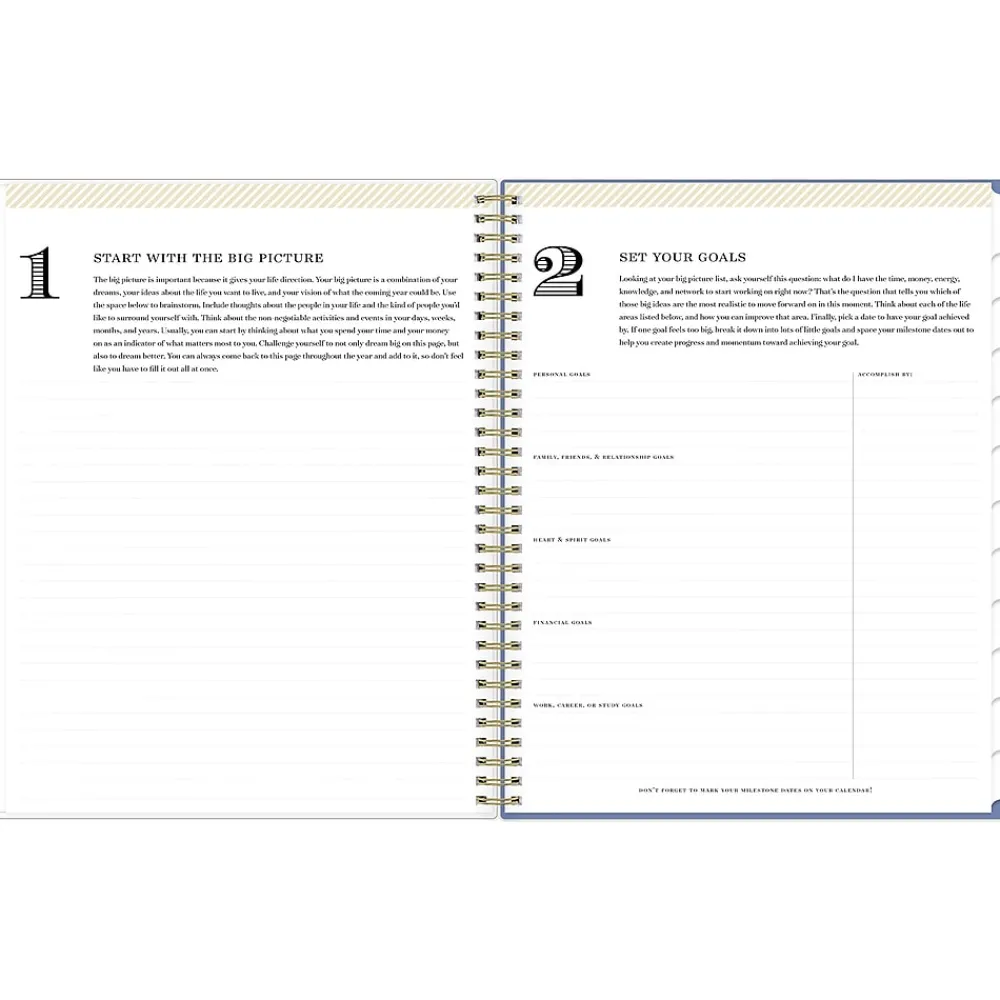 - Storage pocket, gold-tone foil stickers, yearly overview, and goal setting pages