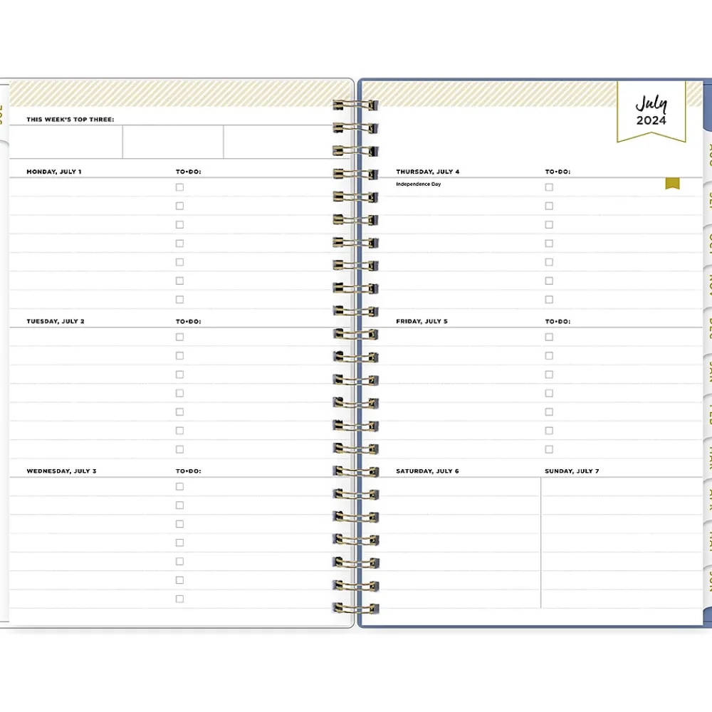 - Weekly and monthly academic planner covers a 12-month date range from July 2024 to June 2025