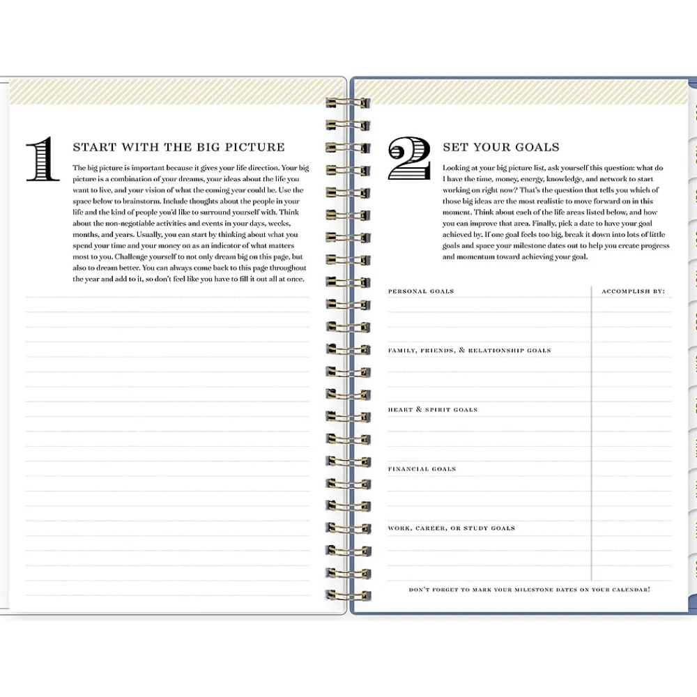 - Includes a storage pocket, gold-tone foil stickers, notes pages, and four-step guide to goal setting