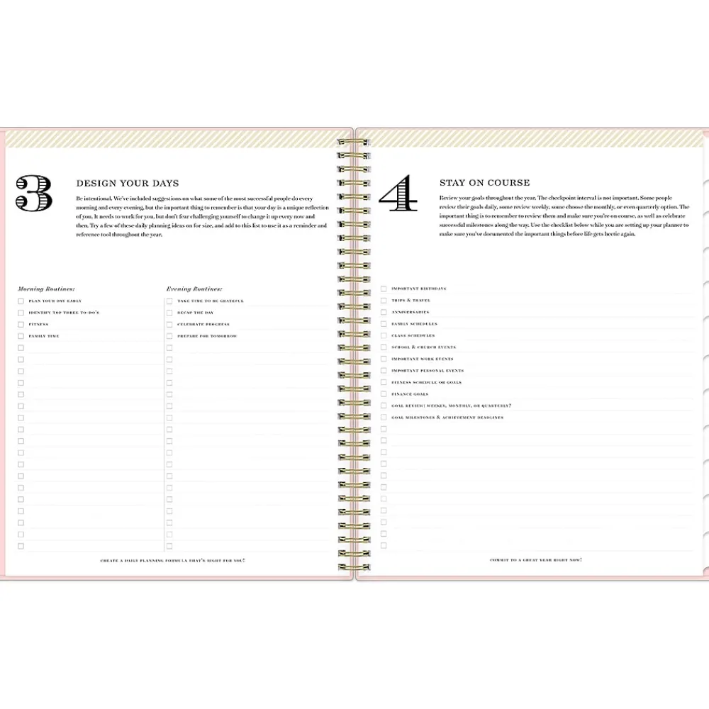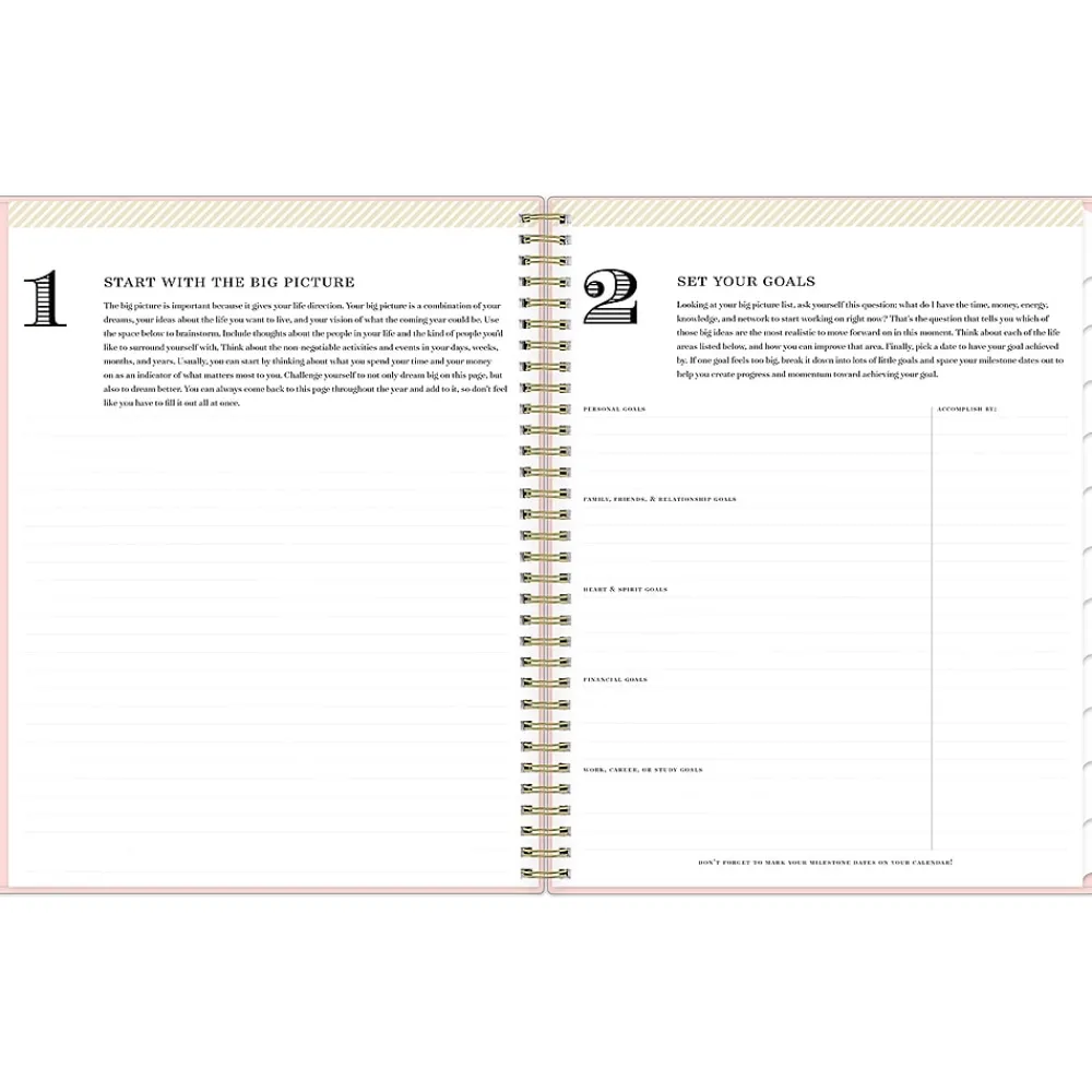 - Includes a storage pocket, gold-tone foil stickers, yearly overview and goal setting pages