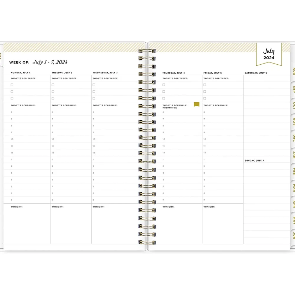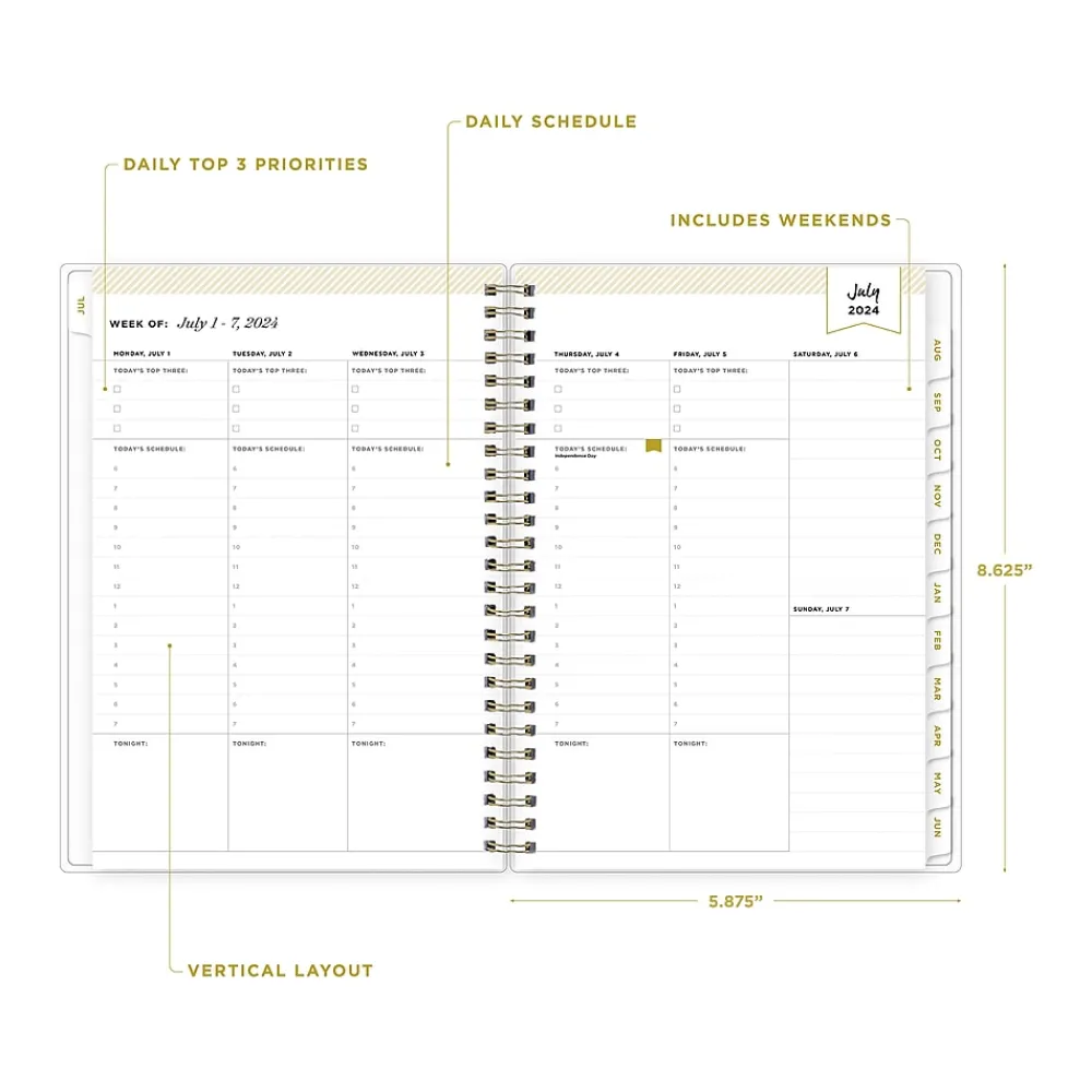 - Weekly and monthly academic planner covers a 12-month date range from July 2024 to June 2025