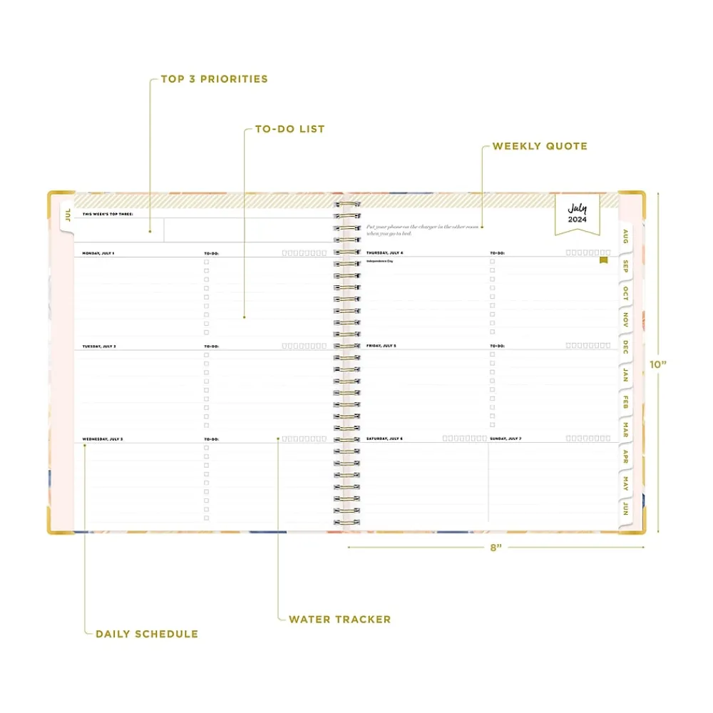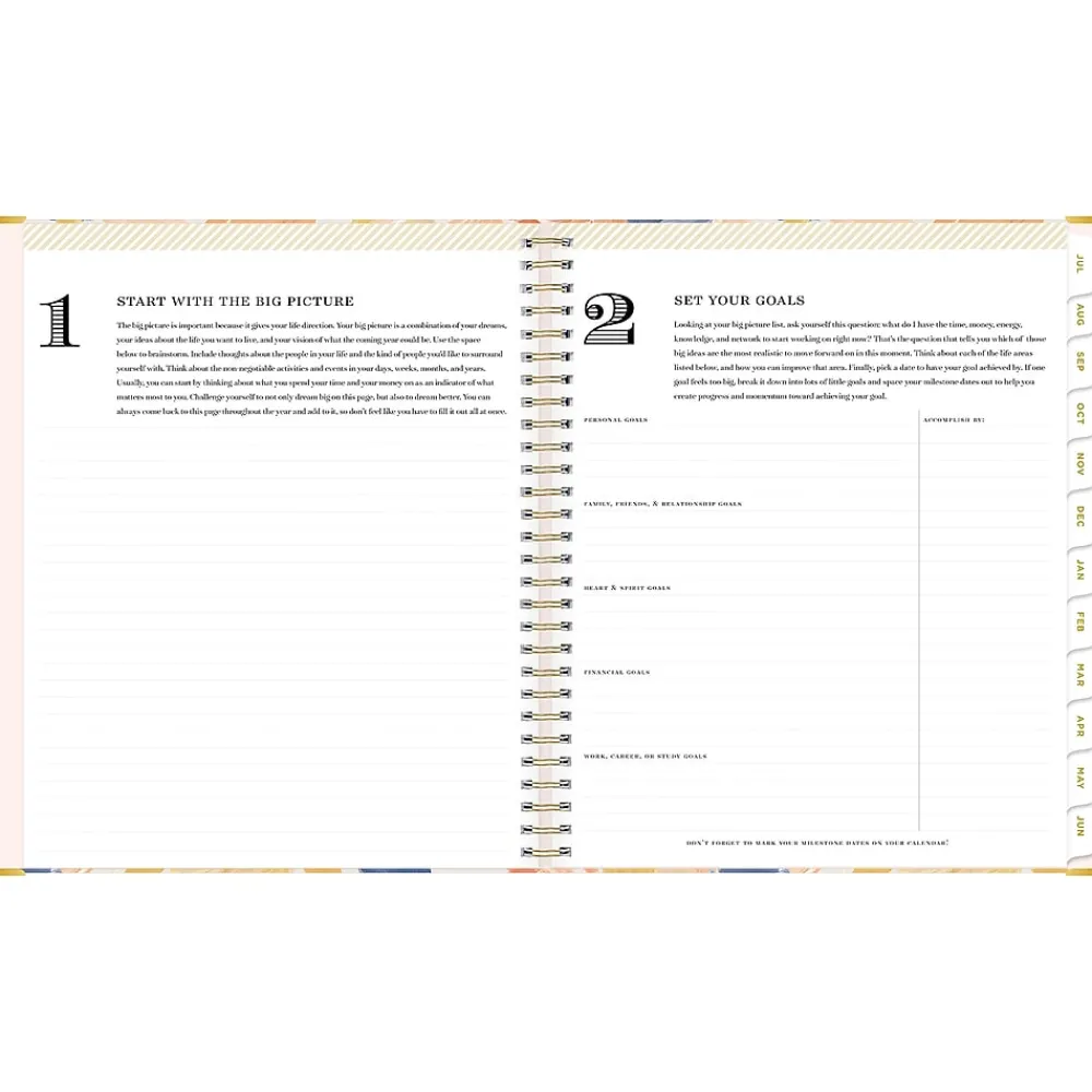 Design your year with Day Designer for Blue Sky academic planners. The In Bloom deluxe hardcover weekly and monthly planner has lined weekly views with room for your top three priorities, tabbed monthly calendars, and notes pages. Enjoy the storage pocket, stickers, and goal setting worksheets for a well-designed academic year.