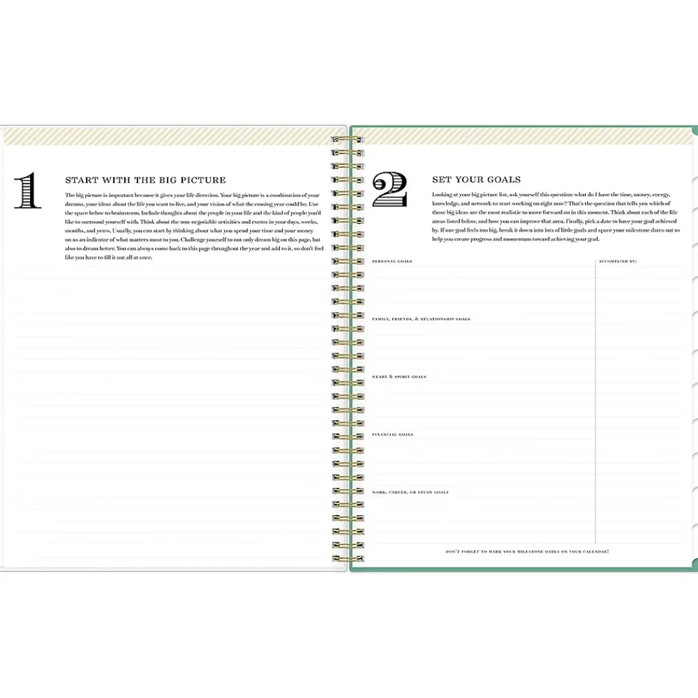 - One week per two-page spread with top three, notes, and gratitude sections; one month per two-page spread with notes and to-do sections; yearly overview and goal-setting pages