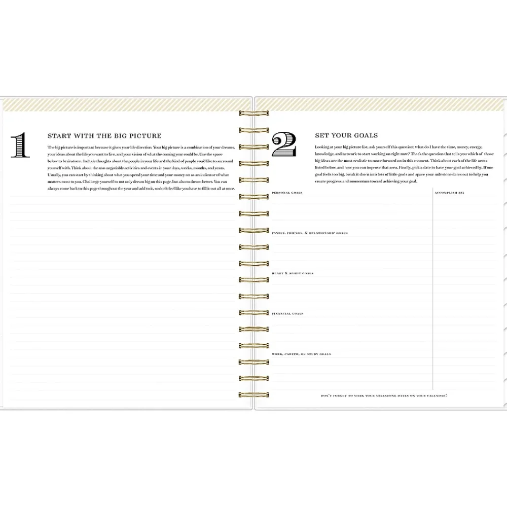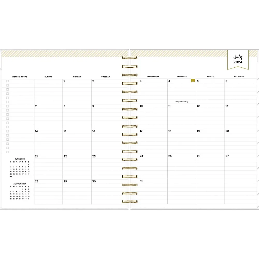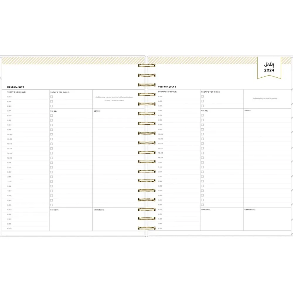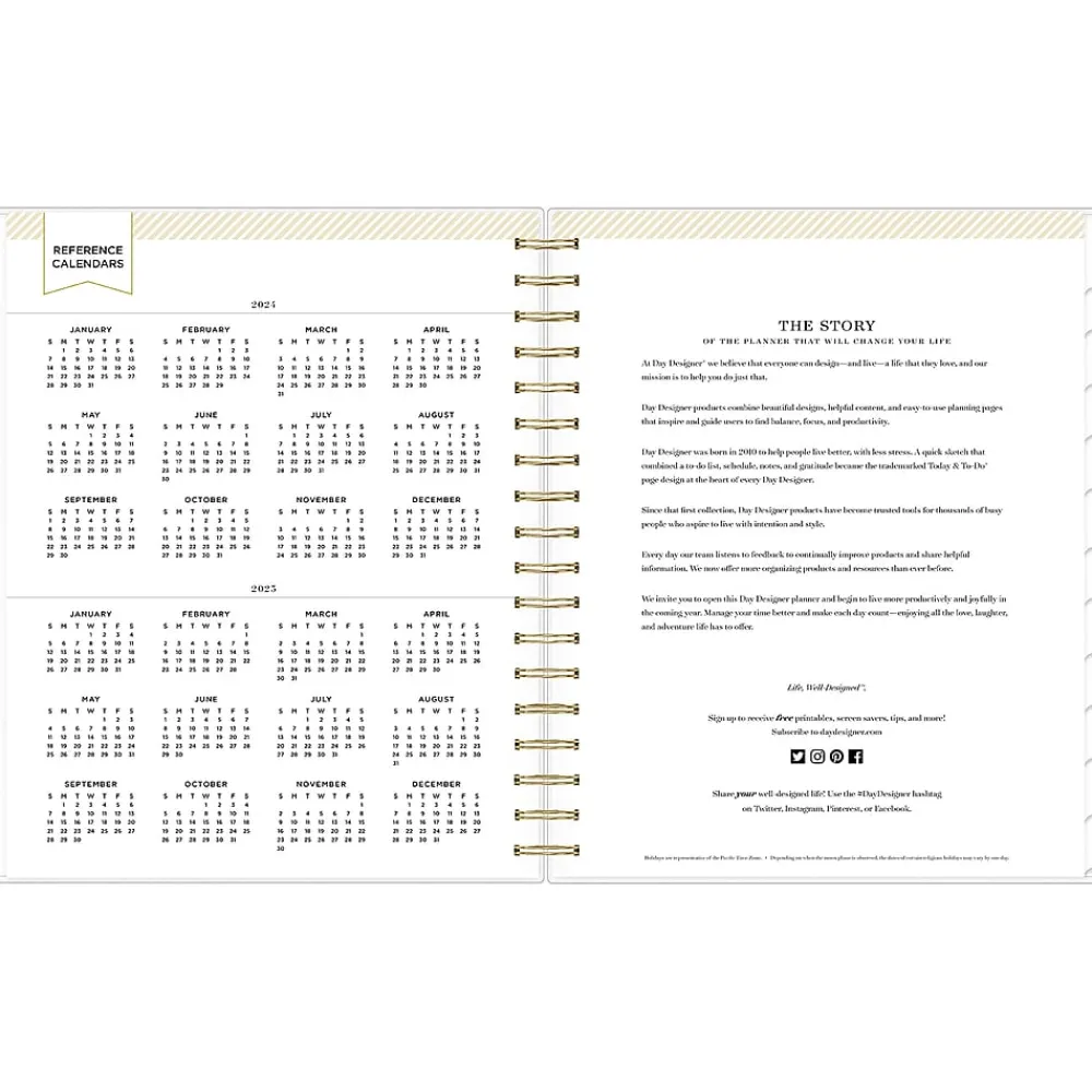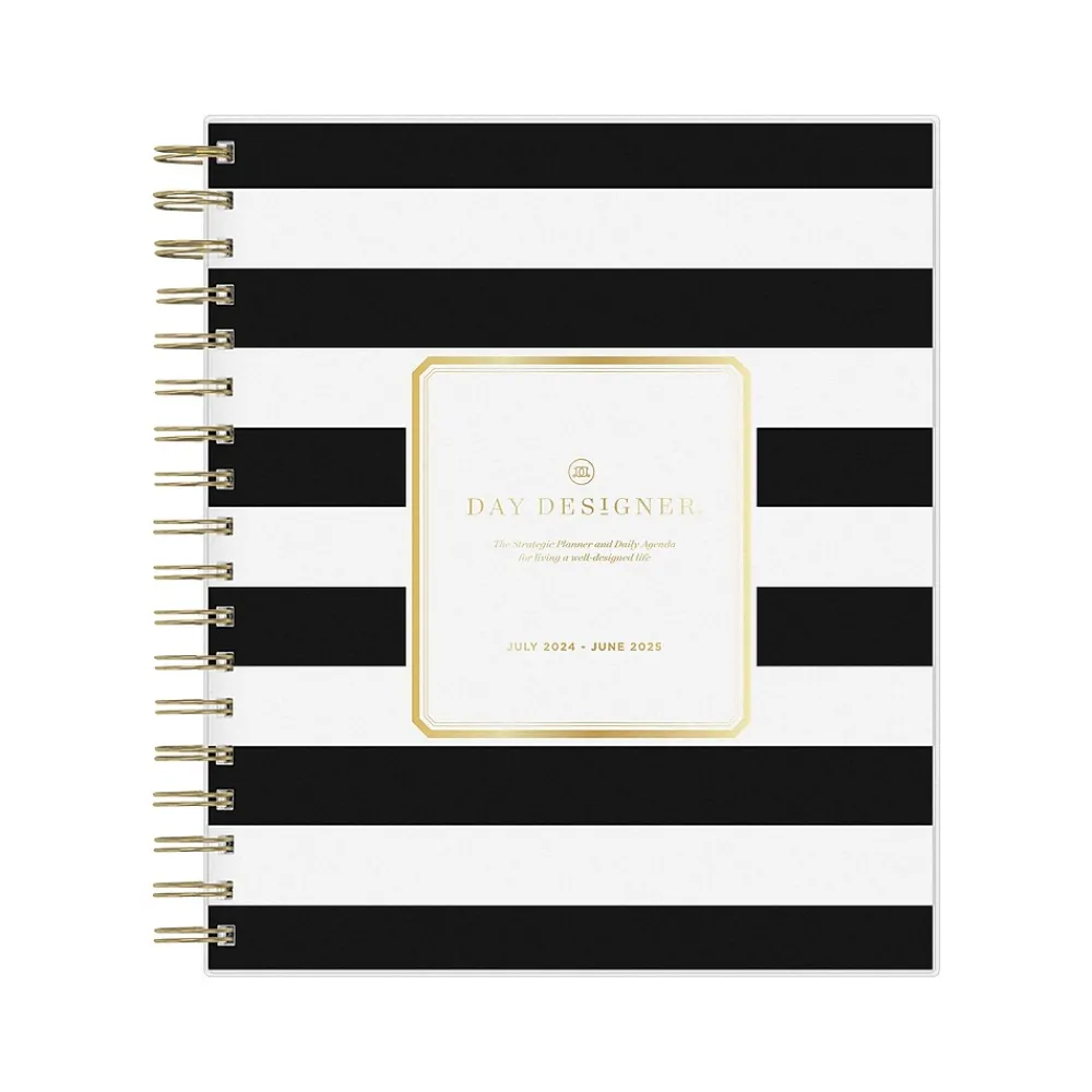 Design your year with Day Designer for Blue Sky academic planners. The Rugby Stripe 2024-2025 daily and monthly planner has hourly planning pages to manage a busy schedule and time-block activities. One page per weekday, and weekends appear on the same page. Includes tabbed monthly views, a storage pocket, stickers, and goal-setting pages.
