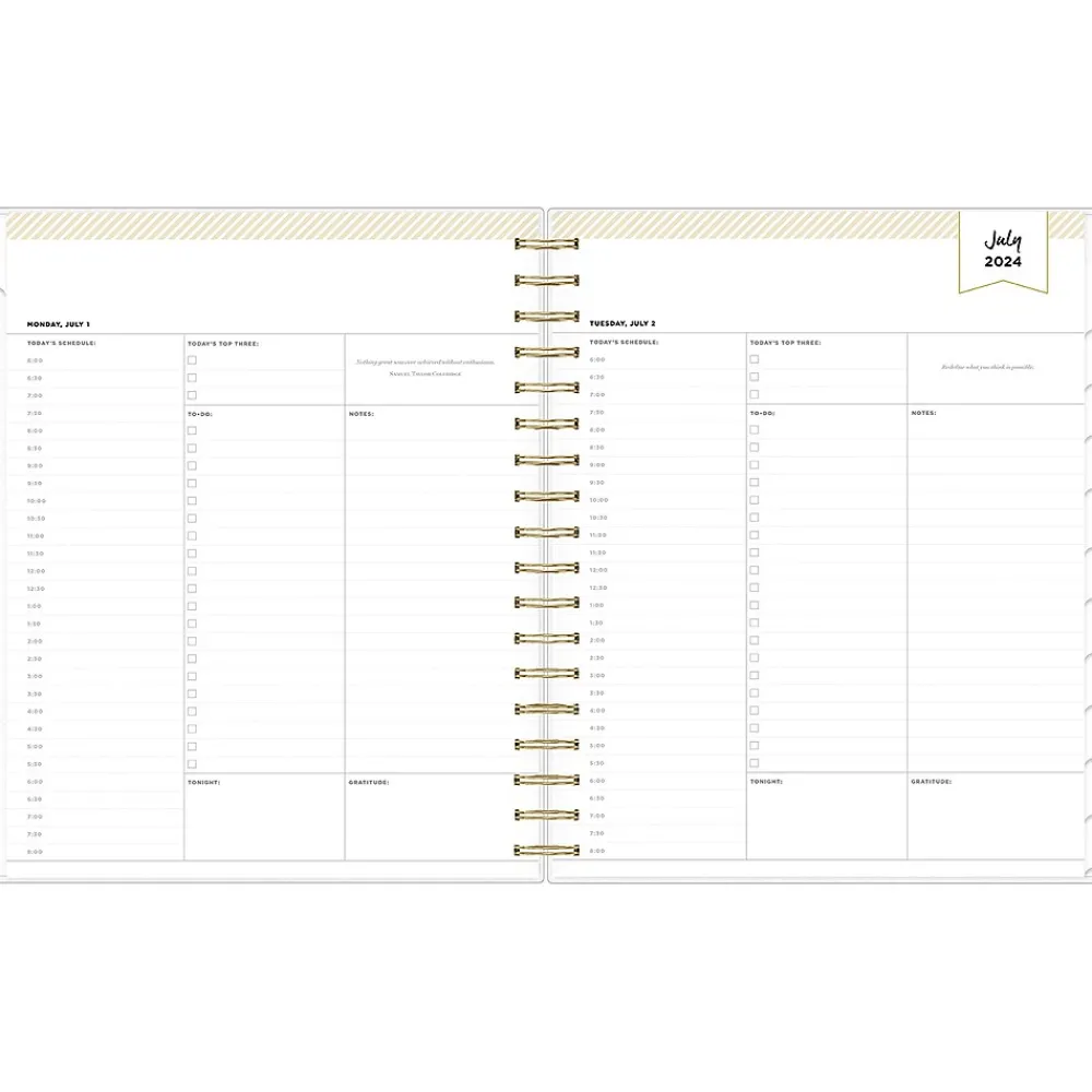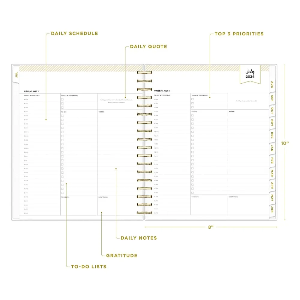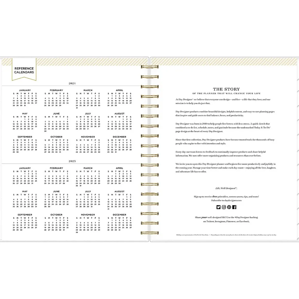 Design your year with Day Designer for Blue Sky academic planners. The Somerset Black 2024-2025 daily and monthly planner has hourly planning pages to manage a busy schedule and time-block activities. One page per weekday, while weekends appear on the same page. Includes tabbed monthly views, a storage pocket, stickers, and goal setting pages.