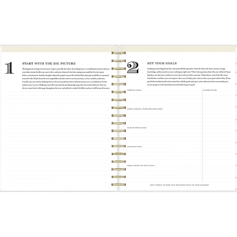 - Offers daily/hourly and monthly pages, with notes pages and four-step guide to goal setting