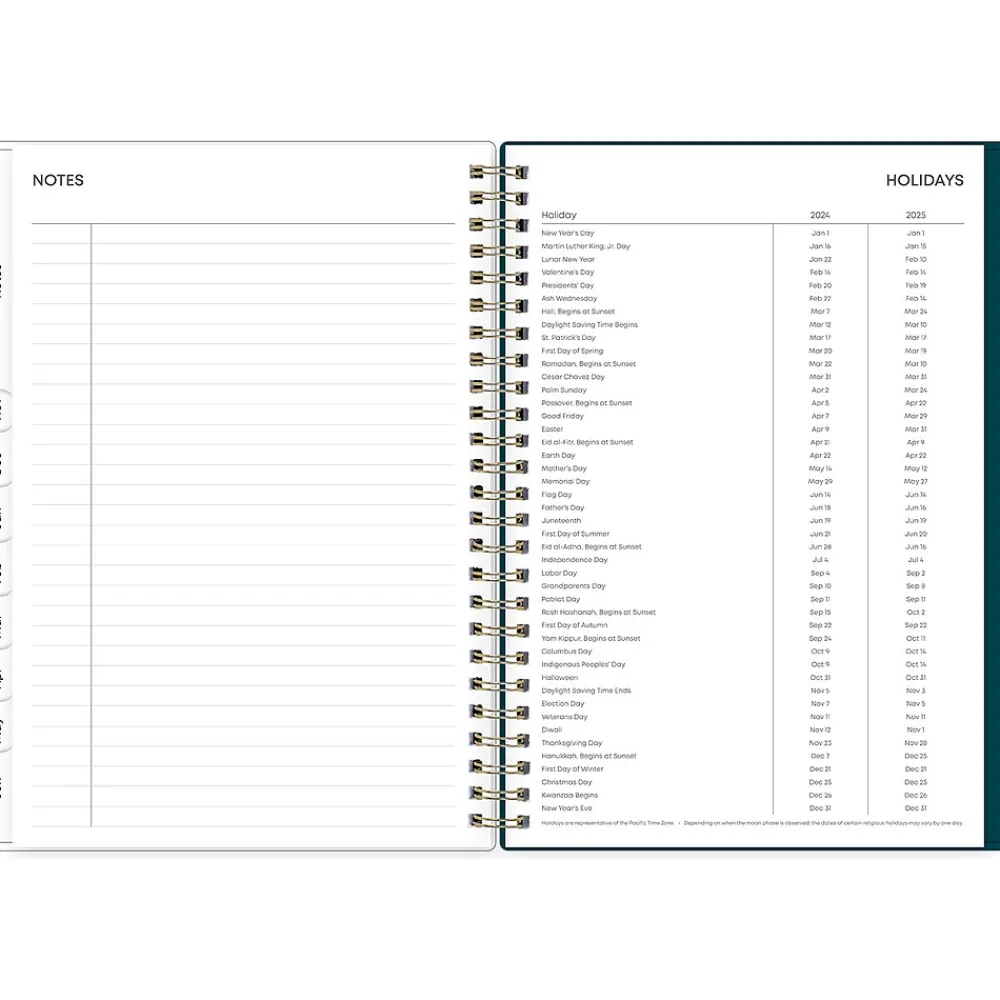 - 30 notes pages, contacts, goals, holidays, and important dates