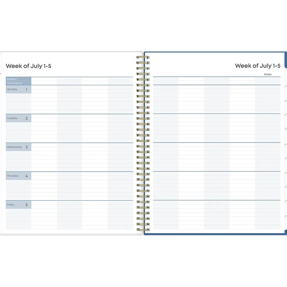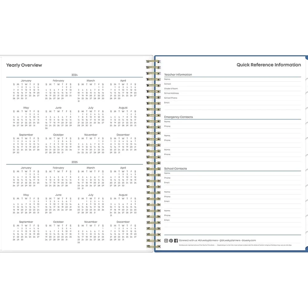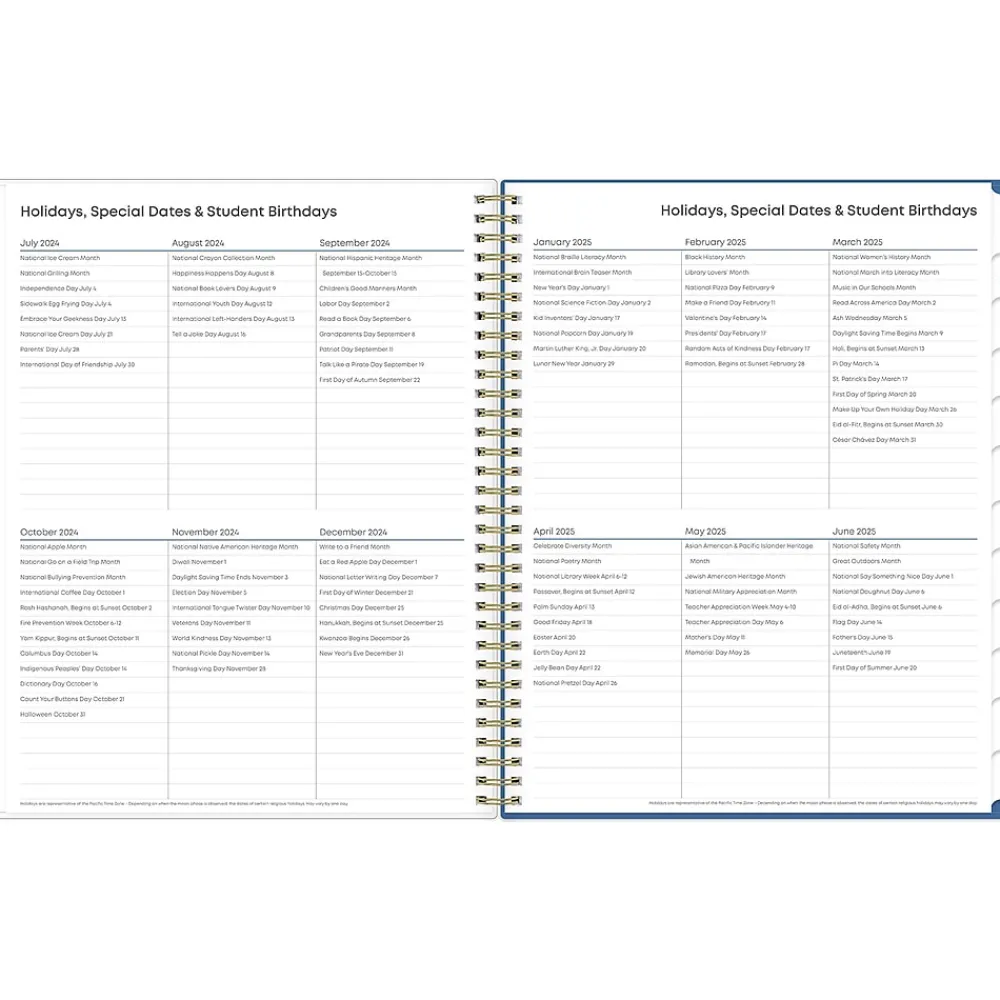 Blue Sky teacher lesson planners keep you focused and organized. The Raquel teacher lesson planner has weekly planning space for up to nine classes or subjects. The monthly pages are tabbed and offer plenty of room for notes. Extras include a storage pocket and pages for weekly activities, class birthdays, and holidays.
