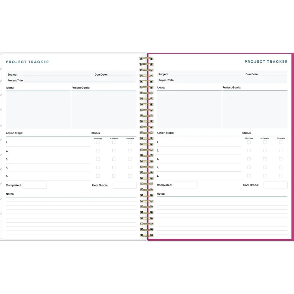 - Features one month per two pages and one week per two pages, with monthly quotes, weekly goals, projects this month section, class schedule, assignment and project tracker