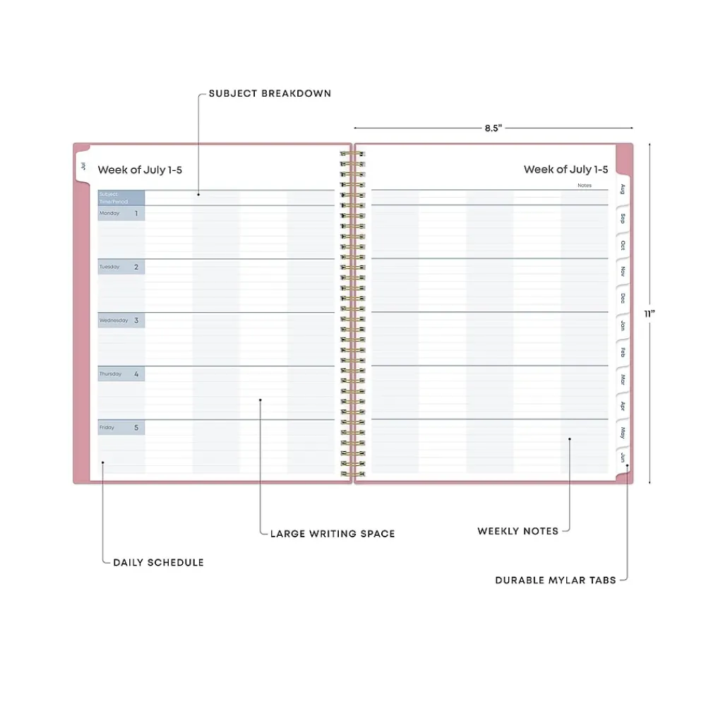 This Blue Sky Teacher Lesson planner keeps you focused and organized. This academic planner has weekly planning space for up to nine classes or subjects. Monthly pages are tabbed and offer plenty of room for notes. Extras include a storage pocket and pages for weekly activities, class birthdays, and holidays.