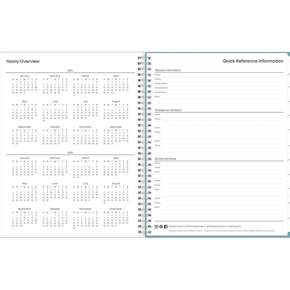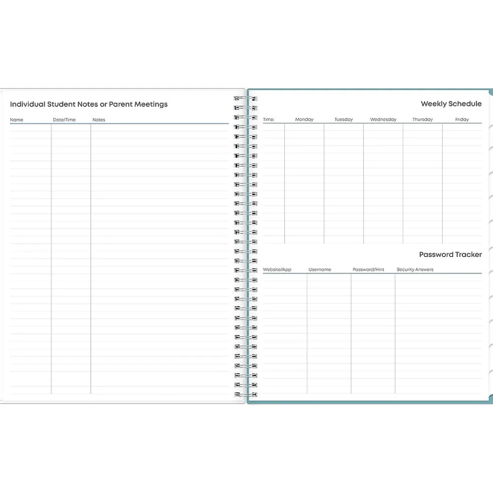 This Blue Sky Teacher Lesson Dots planner has weekly planning space for up to nine classes or subjects. Monthly pages are tabbed and offer plenty of room for notes. Extras include a storage pocket and pages for weekly activities, class birthdays, and holidays.