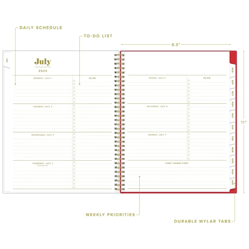 - Weekly and monthly academic planner covers a 12-month date range from July 2024 to June 2025